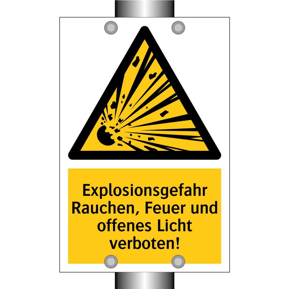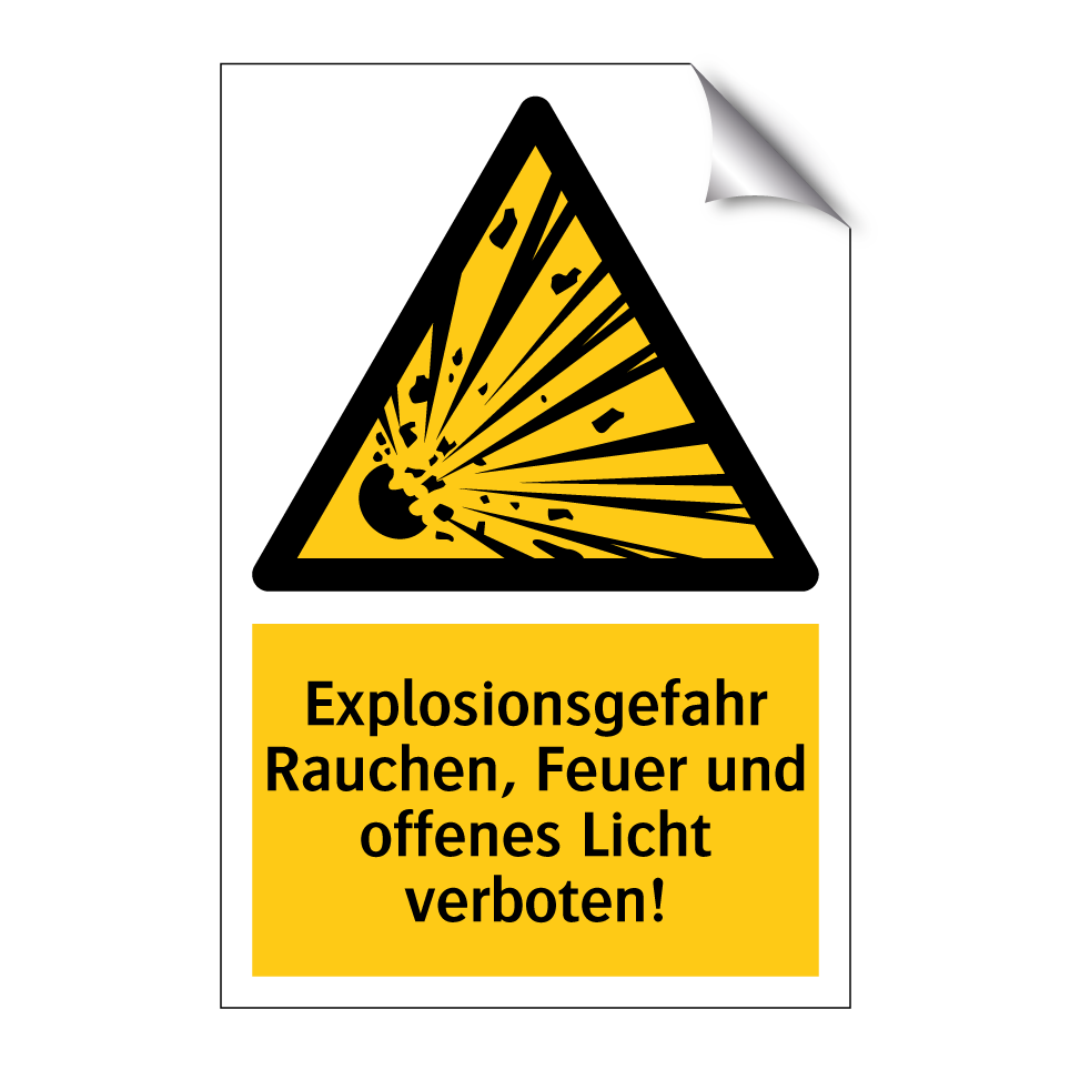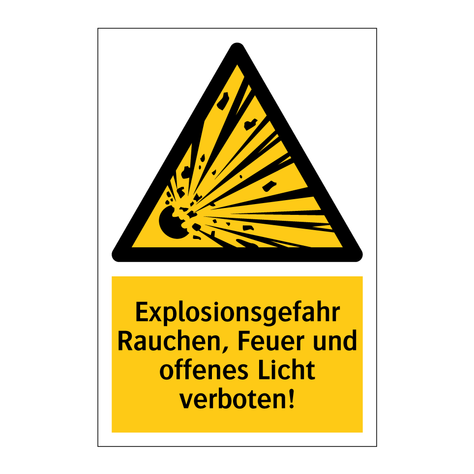 Warnschild mit dem Text Explosionsgefahr Rauchen, Feuer und offenes Licht verboten!