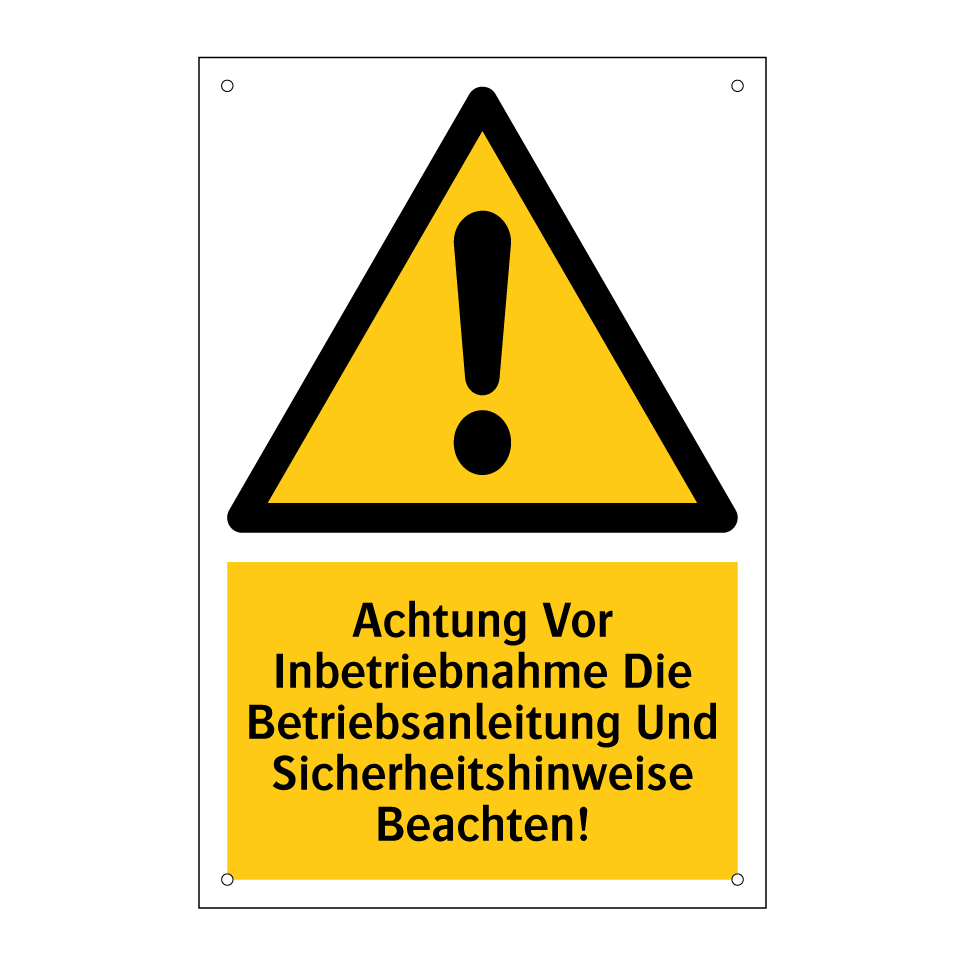 Warnschild mit dem Text Achtung Vor Inbetriebnahme Die Betriebsanleitung Und Sicherheitshinweise Beachten!