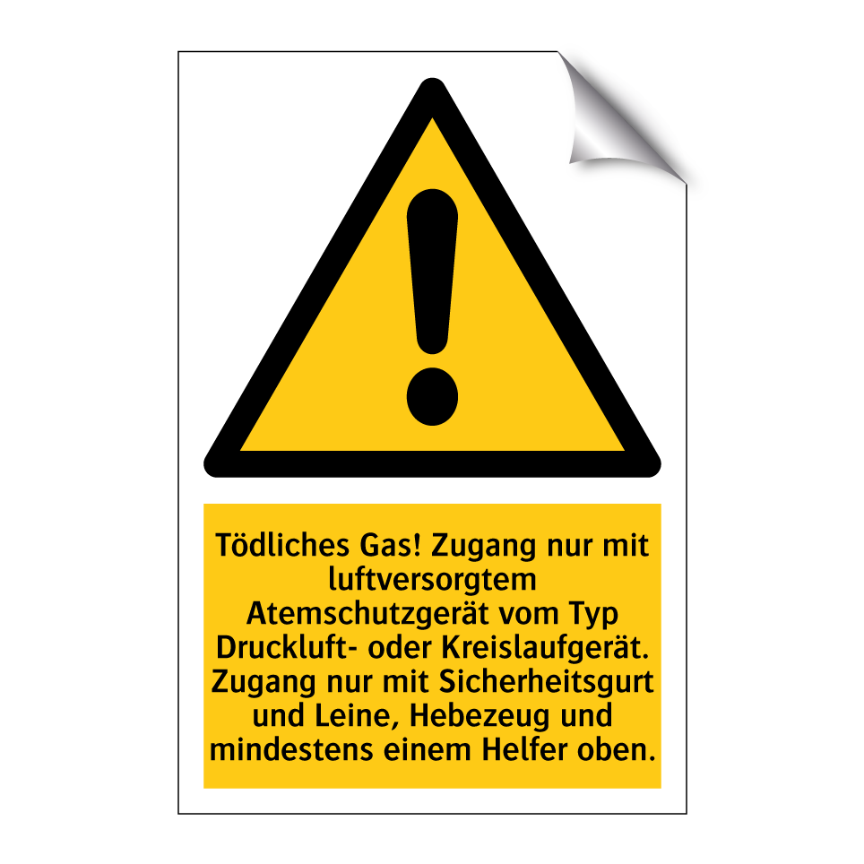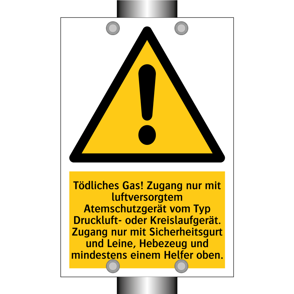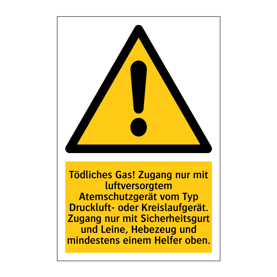 Warnschild mit dem Text Tödliches Gas! Zugang nur mit luftversorgtem Atemschutzgerät vom Typ Druckluft- oder Kreislaufgerät. Zugang nur mit Sicherheitsgurt und Leine, Hebezeug und mindestens einem Helfer oben.