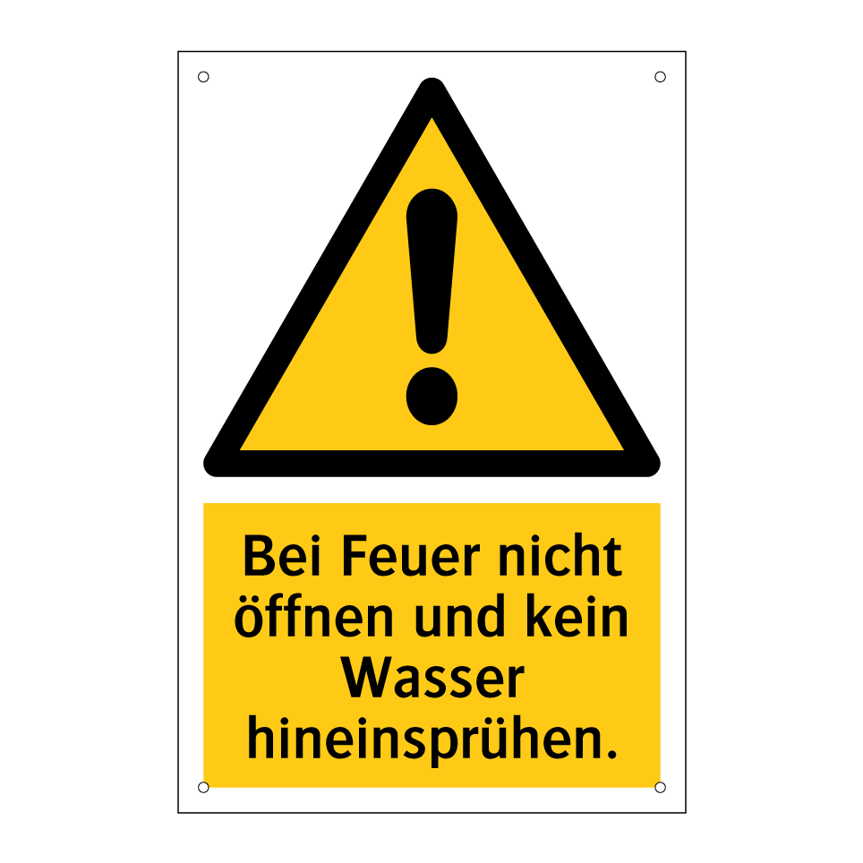 Warnschild mit dem Text Bei Feuer nicht öffnen und kein Wasser hineinsprühen.