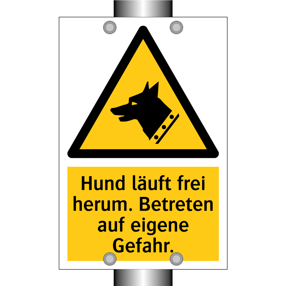 Warnschild mit dem Text Hund läuft frei herum. Betreten auf eigene Gefahr.