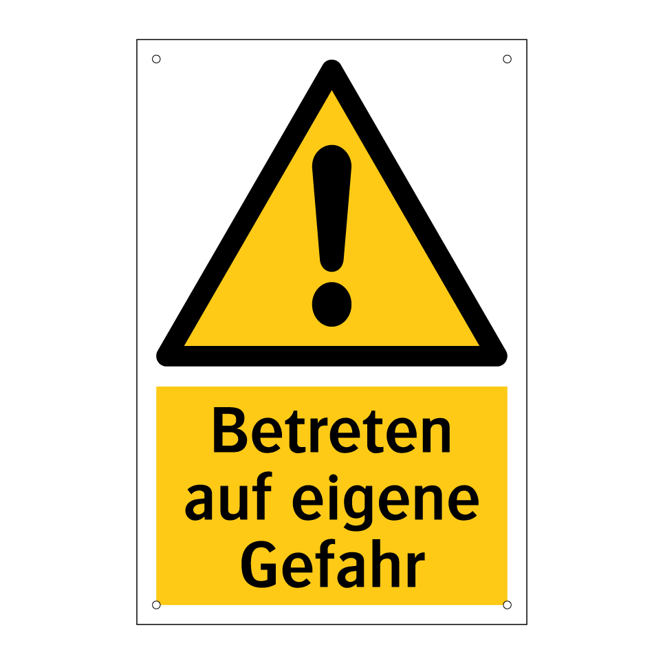 Diese Warnschild mit gelbem Hintergrund und schwarzem Text ist ideal, um auf potenzielle Gefahren hinzuweisen. Es eignet sich hervorragend für Baustellen, Lagerhallen oder andere Bereiche, in denen Vorsicht geboten ist. Die klare Symbolik und die prägnante Botschaft machen es unverzichtbar, um Besucher und Mitarbeiter auf mögliche Risiken aufmerksam zu machen. Platzieren Sie das Warnschild an gut sichtbaren Stellen, um sicherzustellen, dass jeder die Warnung wahrnimmt. Ob in der Nähe von Maschinen, auf unebenem Gelände oder in Bereichen mit eingeschränktem Zugang – dieses Warnschild sorgt für erhöhte Sicherheit und informiert darüber, dass das Betreten auf eigene Verantwortung erfolgt.