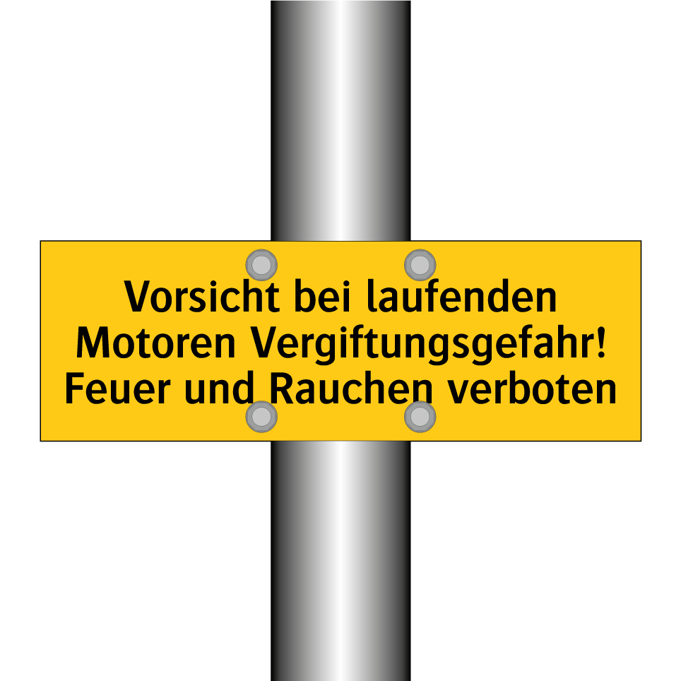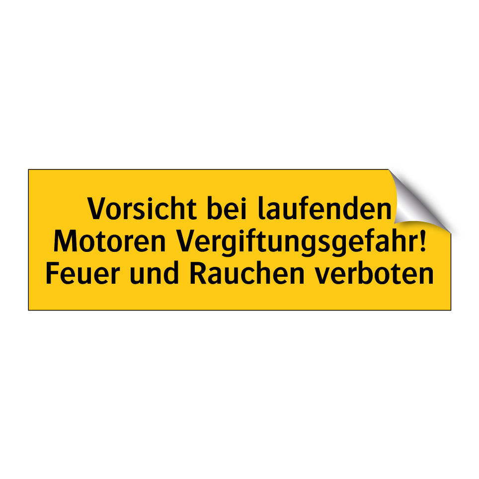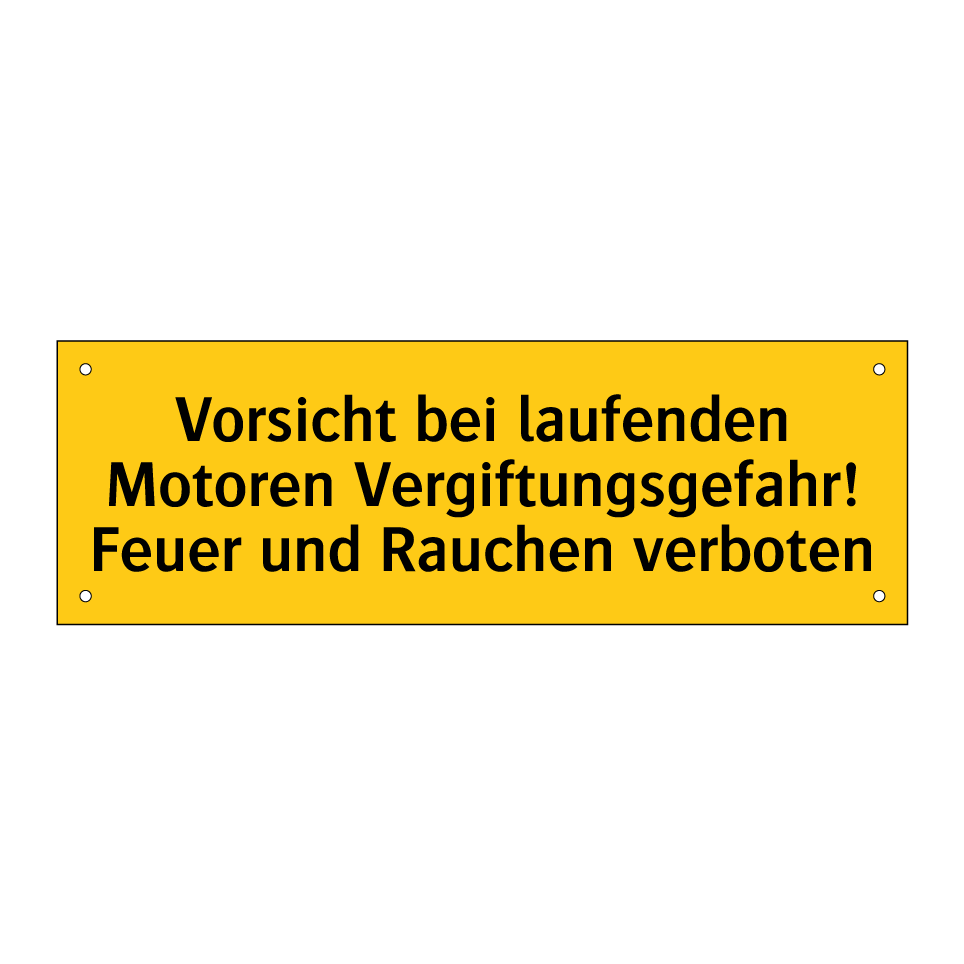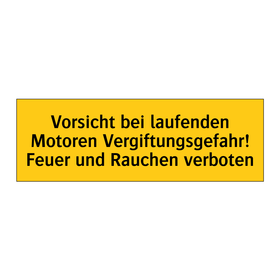 Warnschild mit dem Text Vorsicht bei laufenden Motoren Vergiftungsgefahr! Feuer und Rauchen verboten