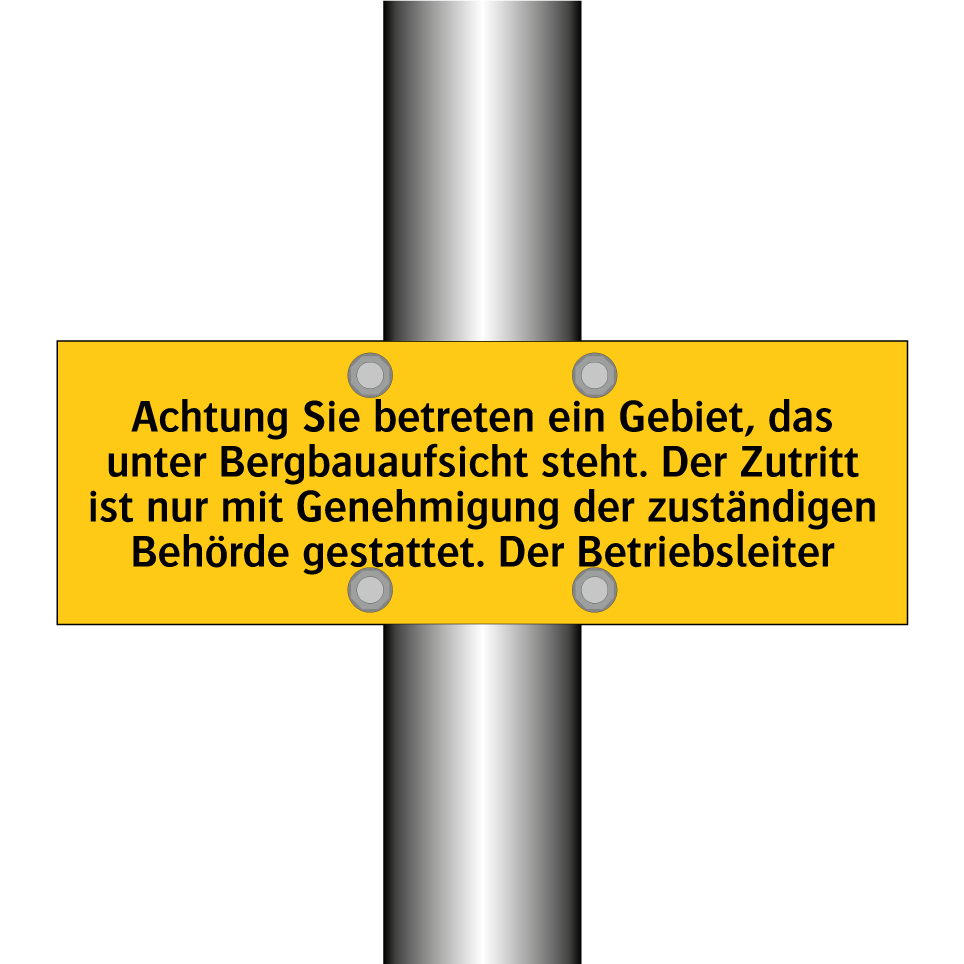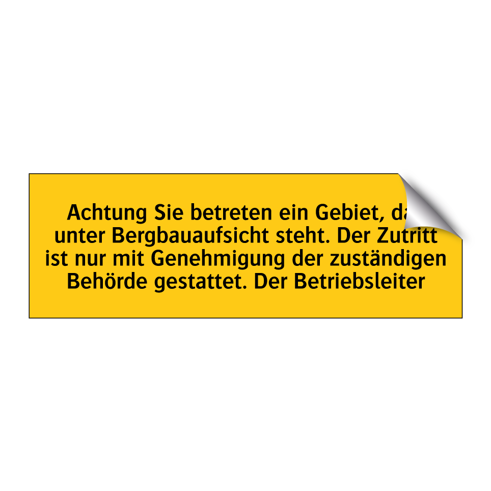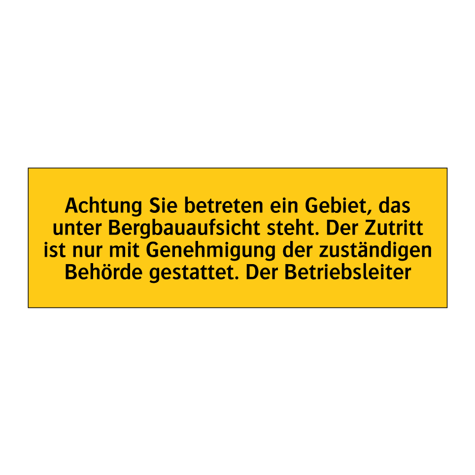 Warnschild mit dem Text Achtung Sie betreten ein Gebiet, das unter Bergbauaufsicht steht. Der Zutritt ist nur mit Genehmigung der zuständigen Behörde gestattet. Der Betriebsleiter