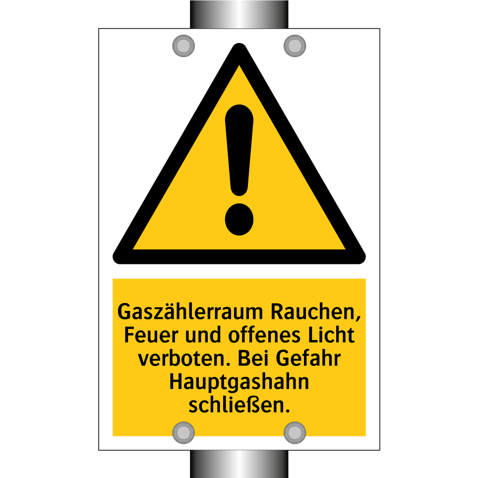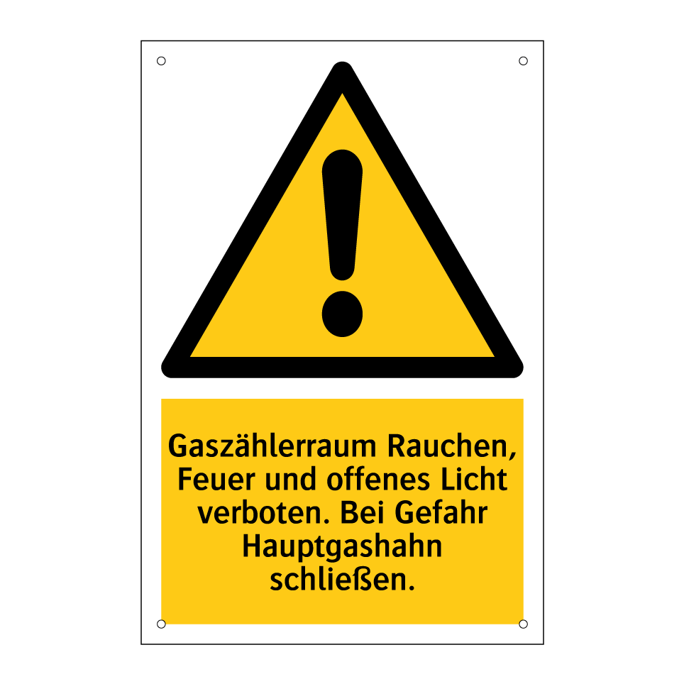 Warnschild mit dem Text Gaszählerraum Rauchen, Feuer und offenes Licht verboten. Bei Gefahr Hauptgashahn schließen.