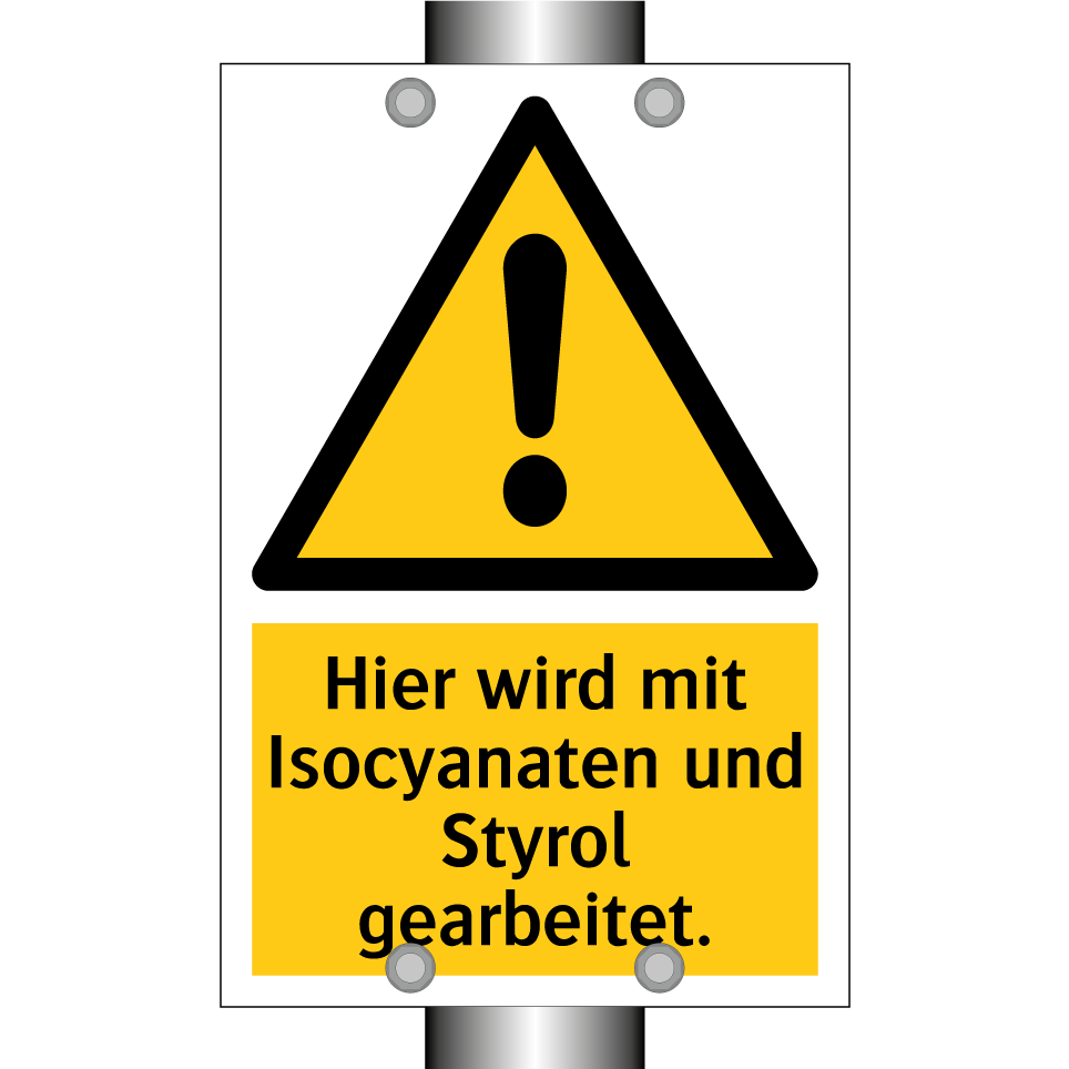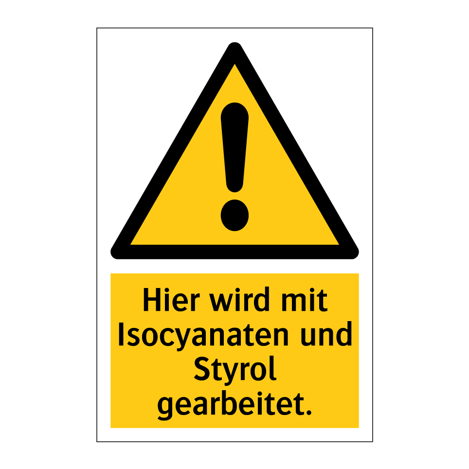 Warnschild mit dem Text Hier wird mit Isocyanaten und Styrol gearbeitet.
