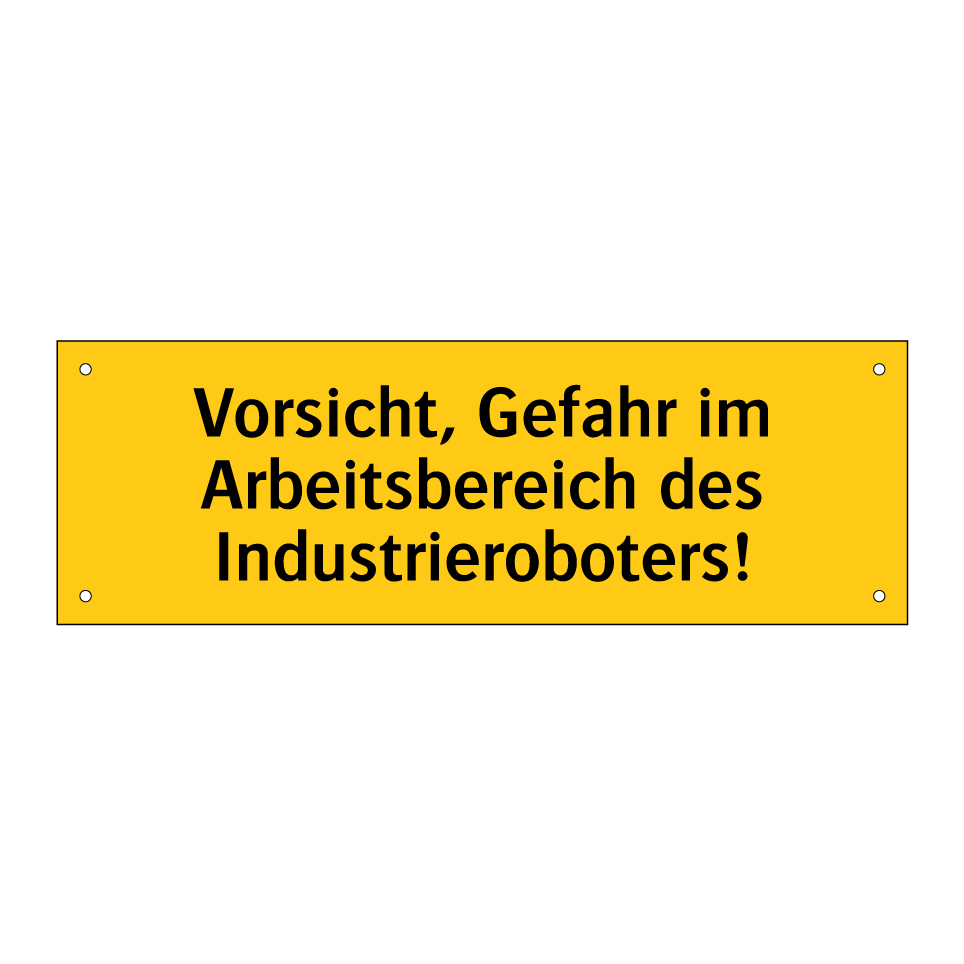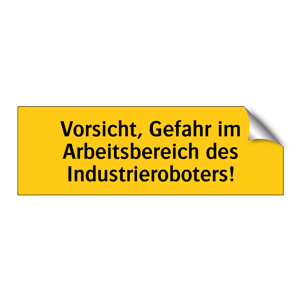 Warnschild mit dem Text Vorsicht, Gefahr im Arbeitsbereich des Industrieroboters!