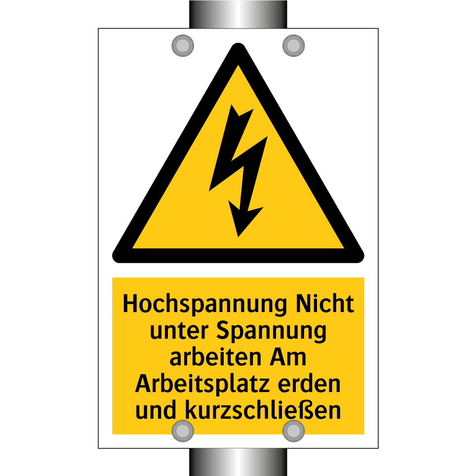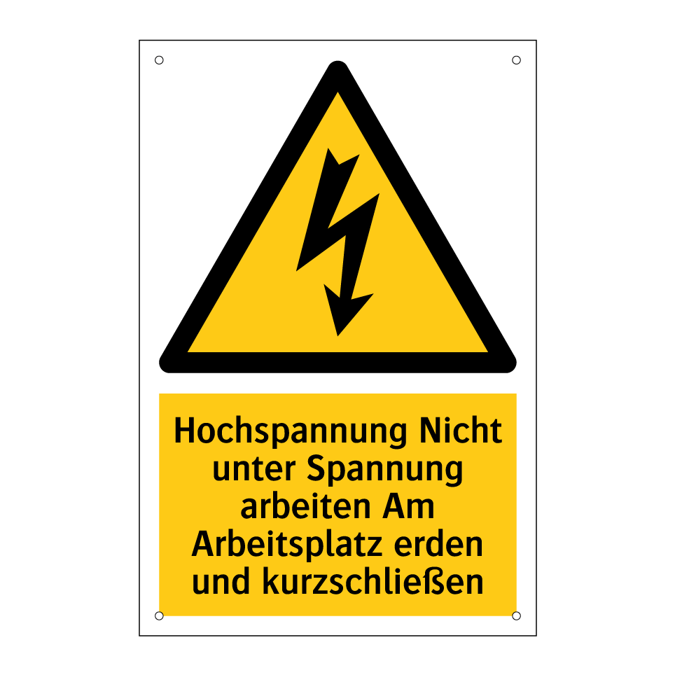 Warnschild mit dem Text Hochspannung Nicht unter Spannung arbeiten Am Arbeitsplatz erden und kurzschließen