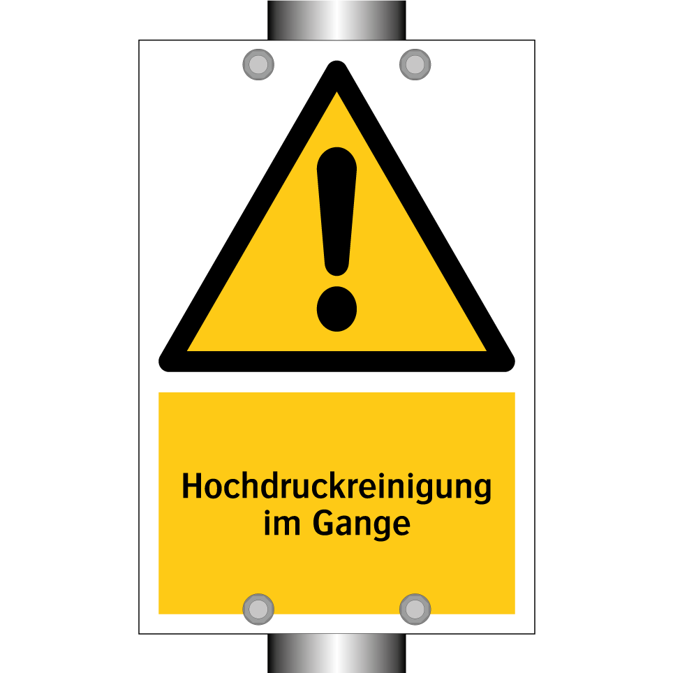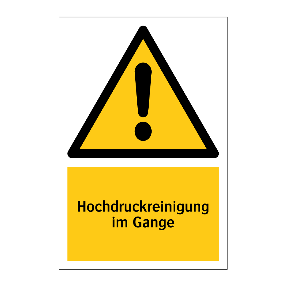 Warnschild mit dem Text Hochdruckreinigung im Gange