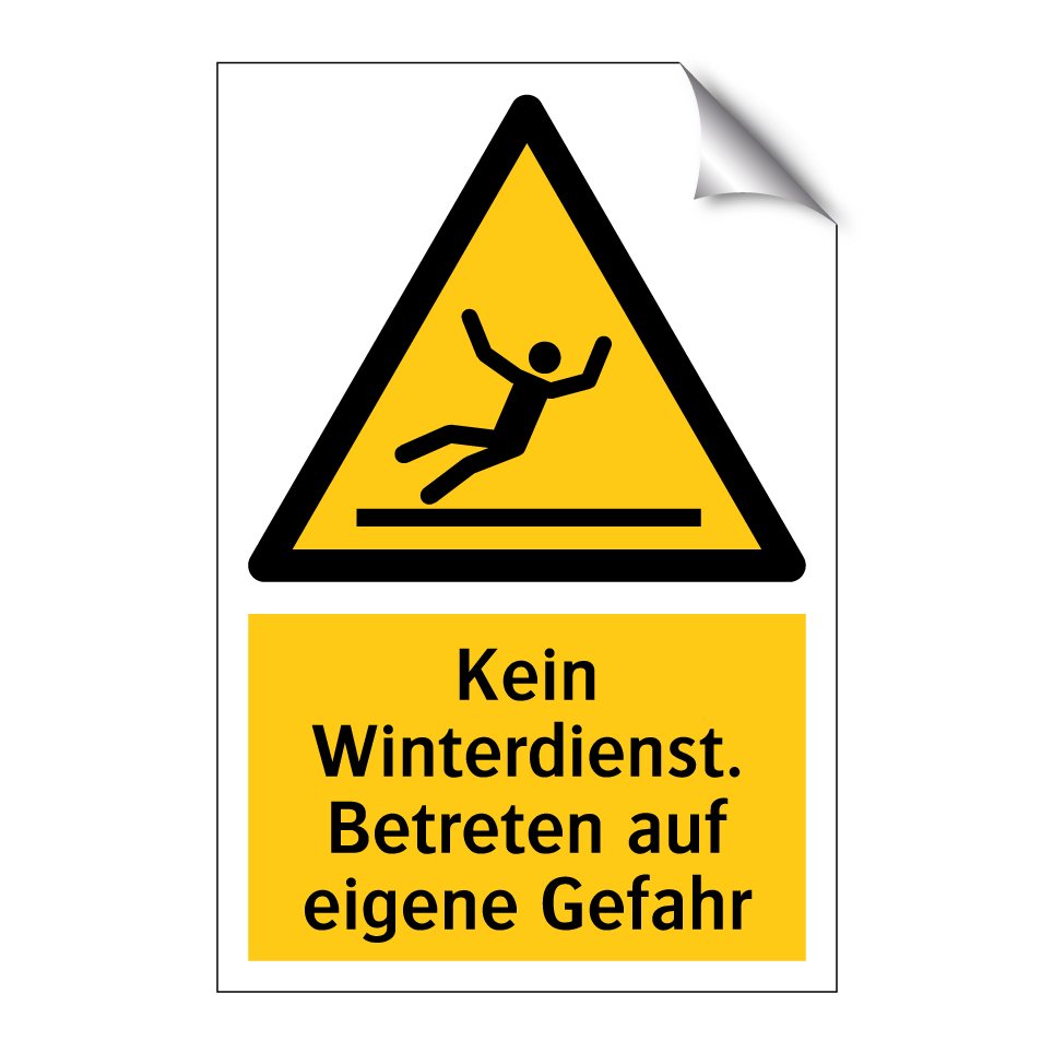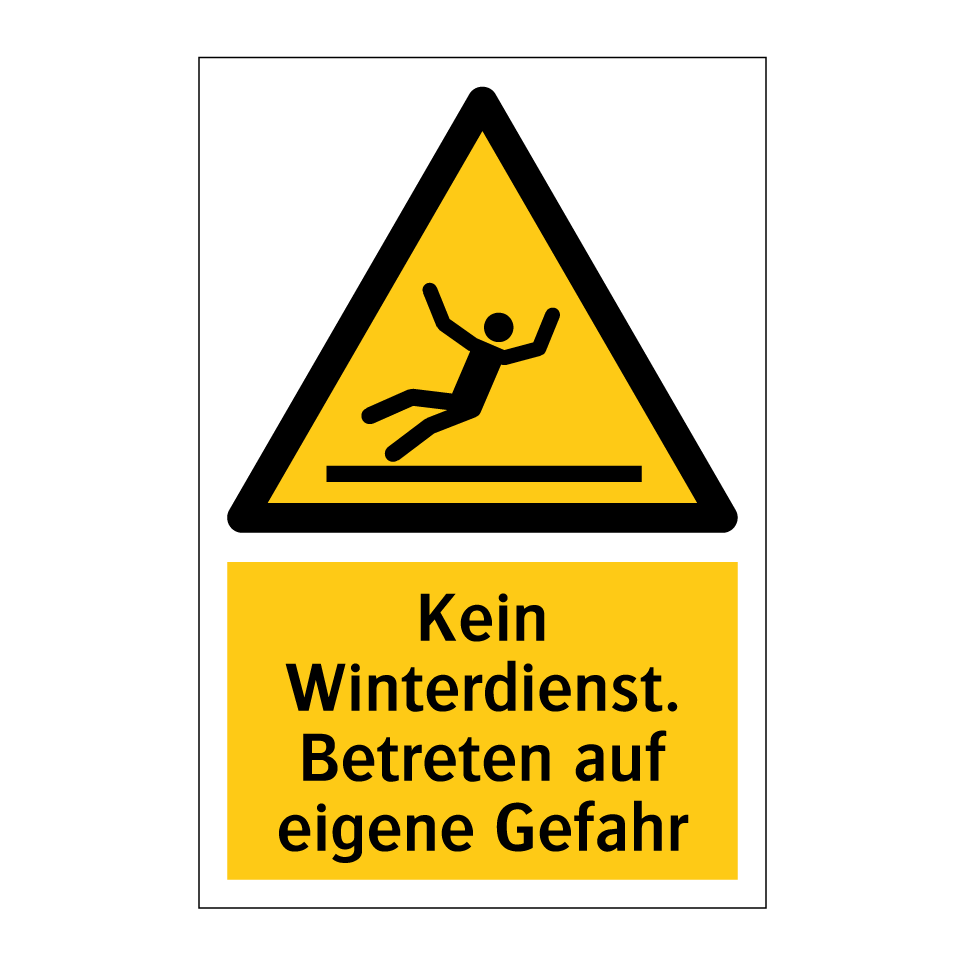 Diese auffällige Warnschild mit gelbem Hintergrund und schwarzem Text ist ideal, um auf potenzielle Gefahren im Winter hinzuweisen. Sie eignet sich hervorragend für den Einsatz in Bereichen, in denen kein Winterdienst stattfindet, wie z.B. auf privaten Zufahrten, Gehwegen oder Parkplätzen. Die klare Symbolik und der prägnante Text machen es unmissverständlich, dass das Betreten auf eigene Gefahr erfolgt. Diese Warnschilder sind besonders nützlich, um Besucher und Anwohner auf die Risiken von Schnee und Eis aufmerksam zu machen und so Unfälle zu vermeiden. Platzieren Sie das Schild an gut sichtbaren Stellen, um maximale Aufmerksamkeit zu gewährleisten.