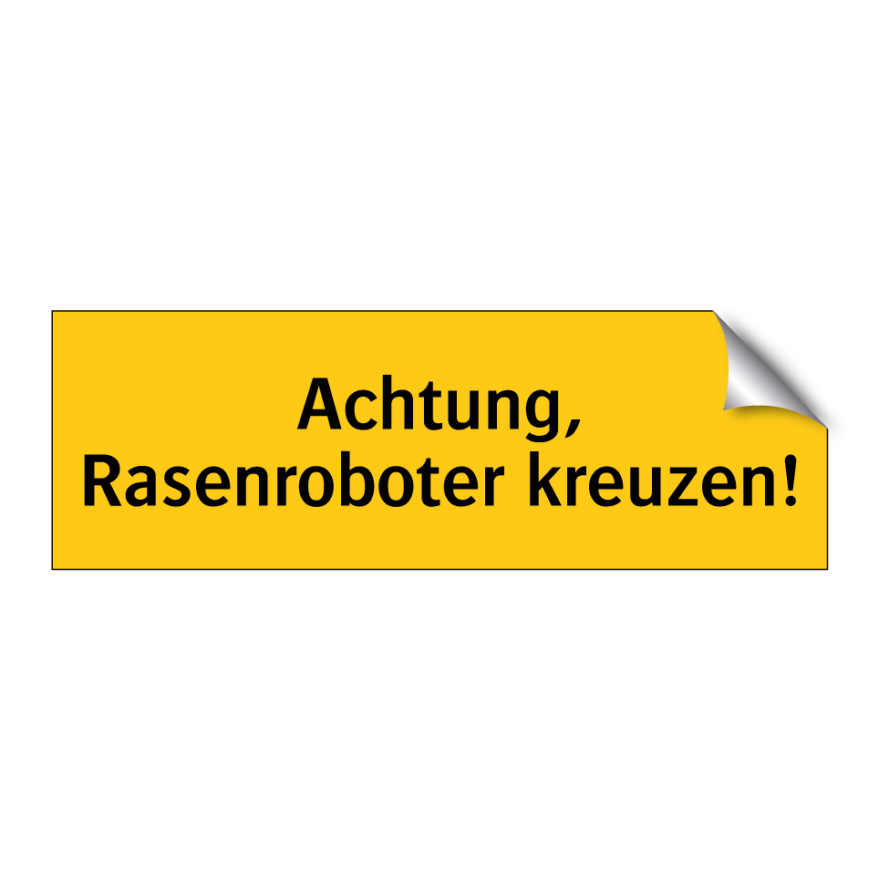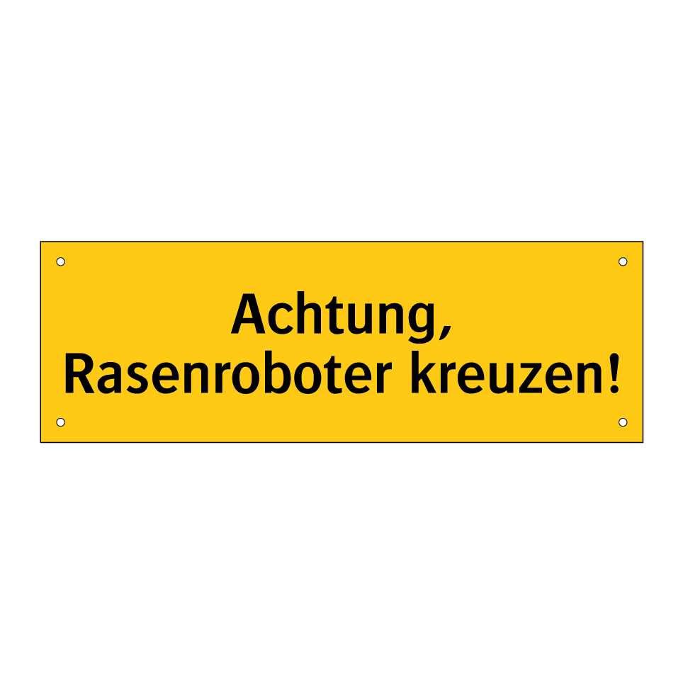 Warnschild mit dem Text Achtung, Rasenroboter kreuzen!