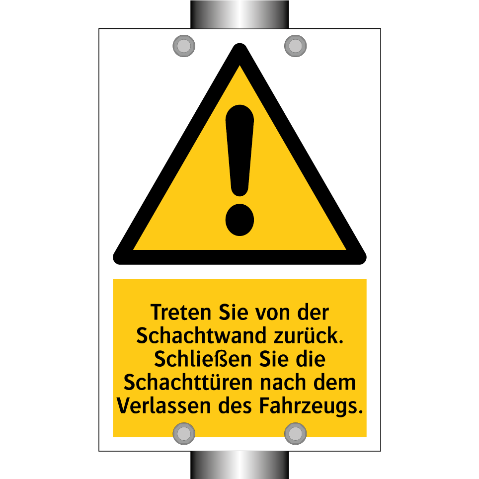 Warnschild mit dem Text Treten Sie von der Schachtwand zurück. Schließen Sie die Schachttüren nach dem Verlassen des Fahrzeugs.