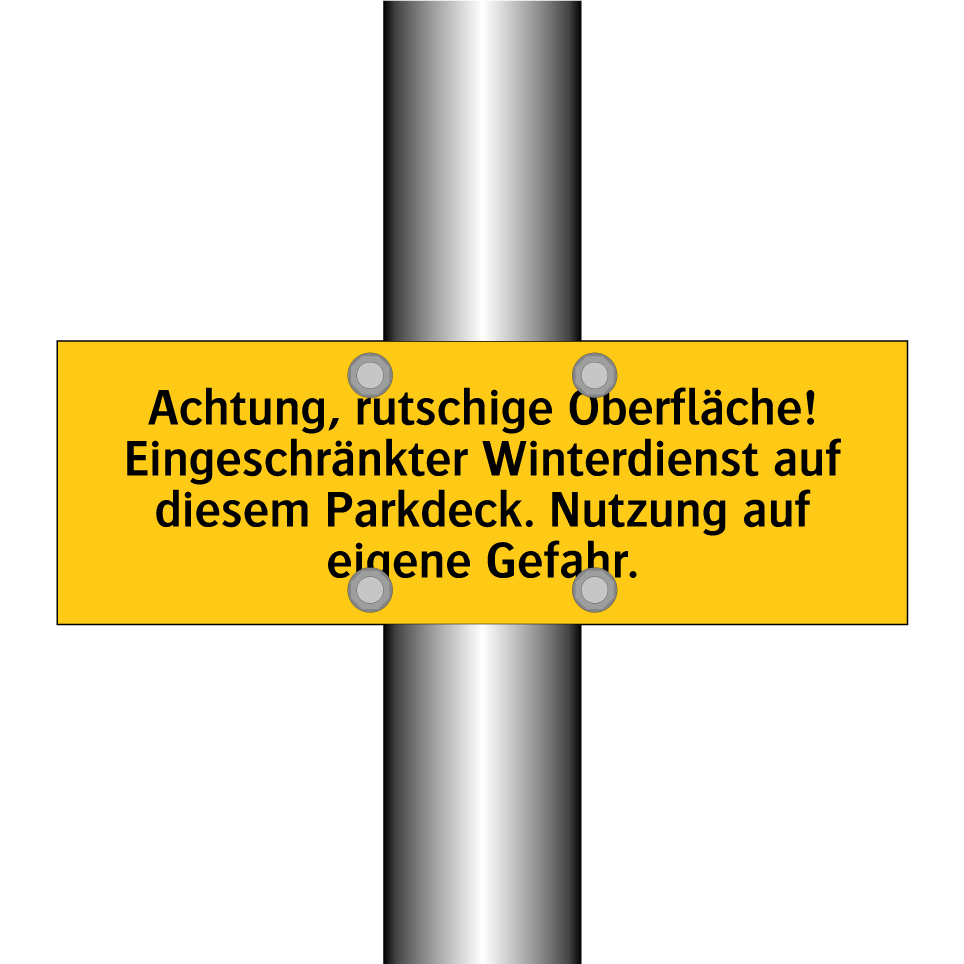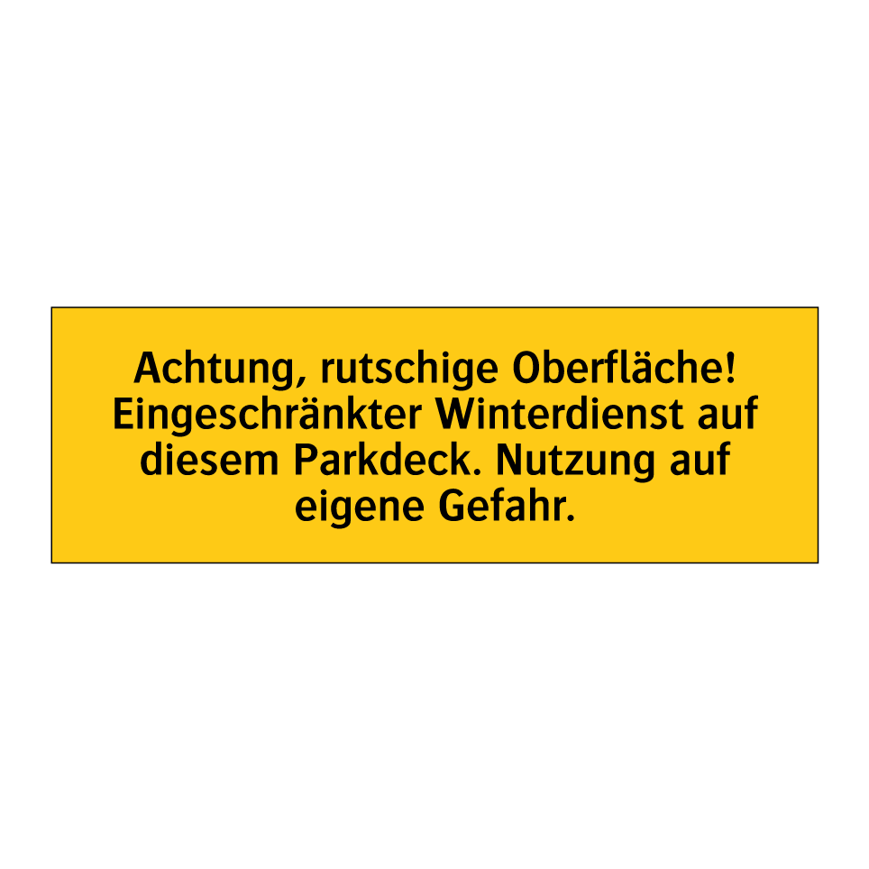 Warnschild mit dem Text Achtung, rutschige Oberfläche! Eingeschränkter Winterdienst auf diesem Parkdeck. Nutzung auf eigene Gefahr.