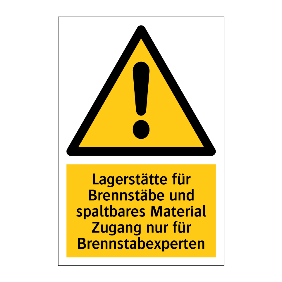 Warnschild mit dem Text Lagerstätte für Brennstäbe und spaltbares Material Zugang nur für Brennstabexperten