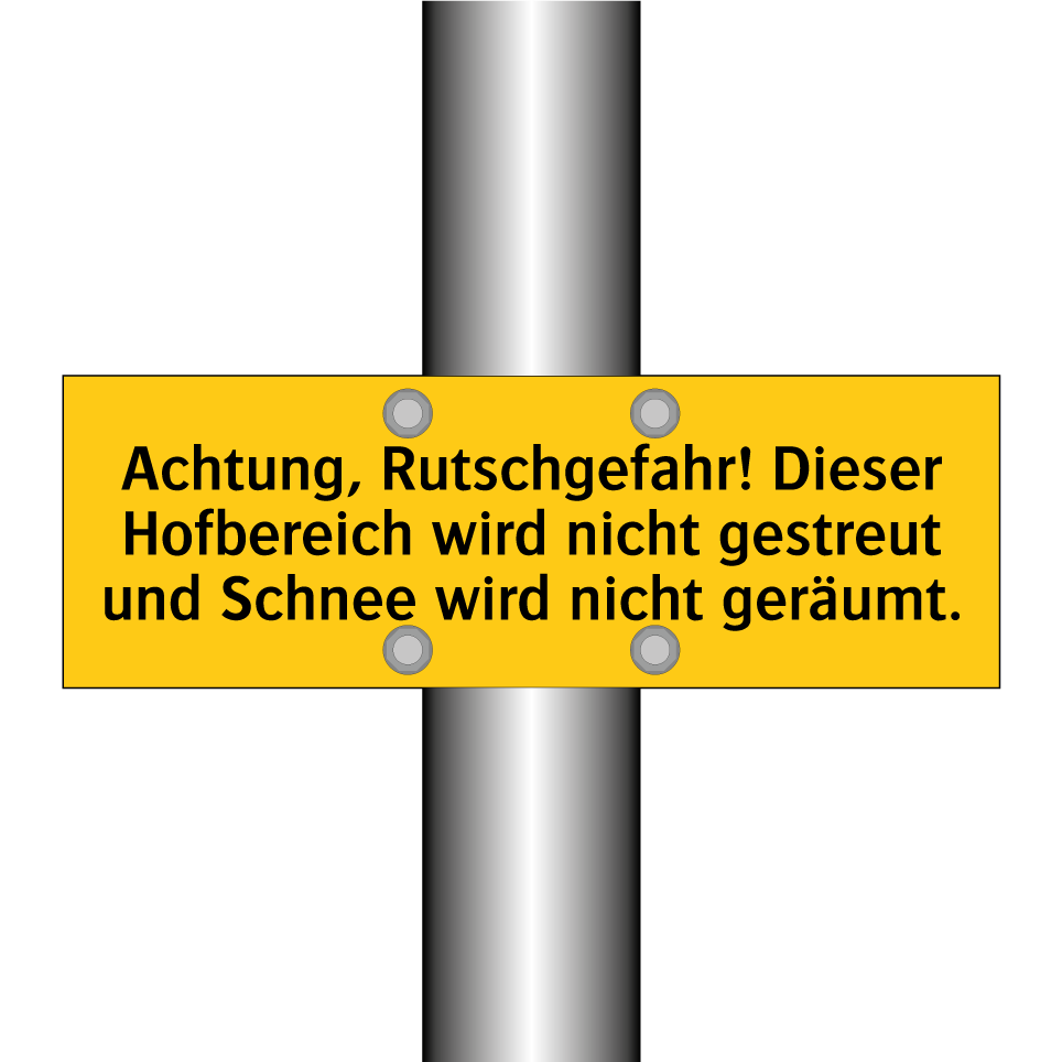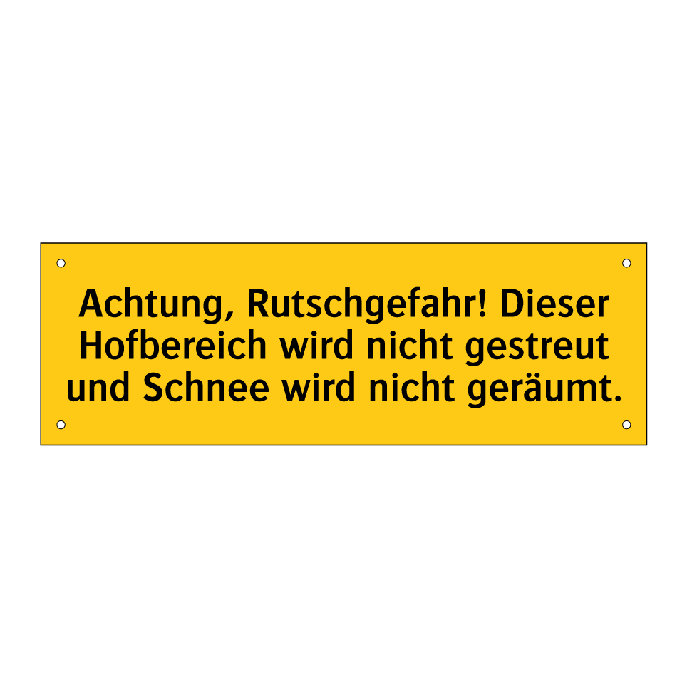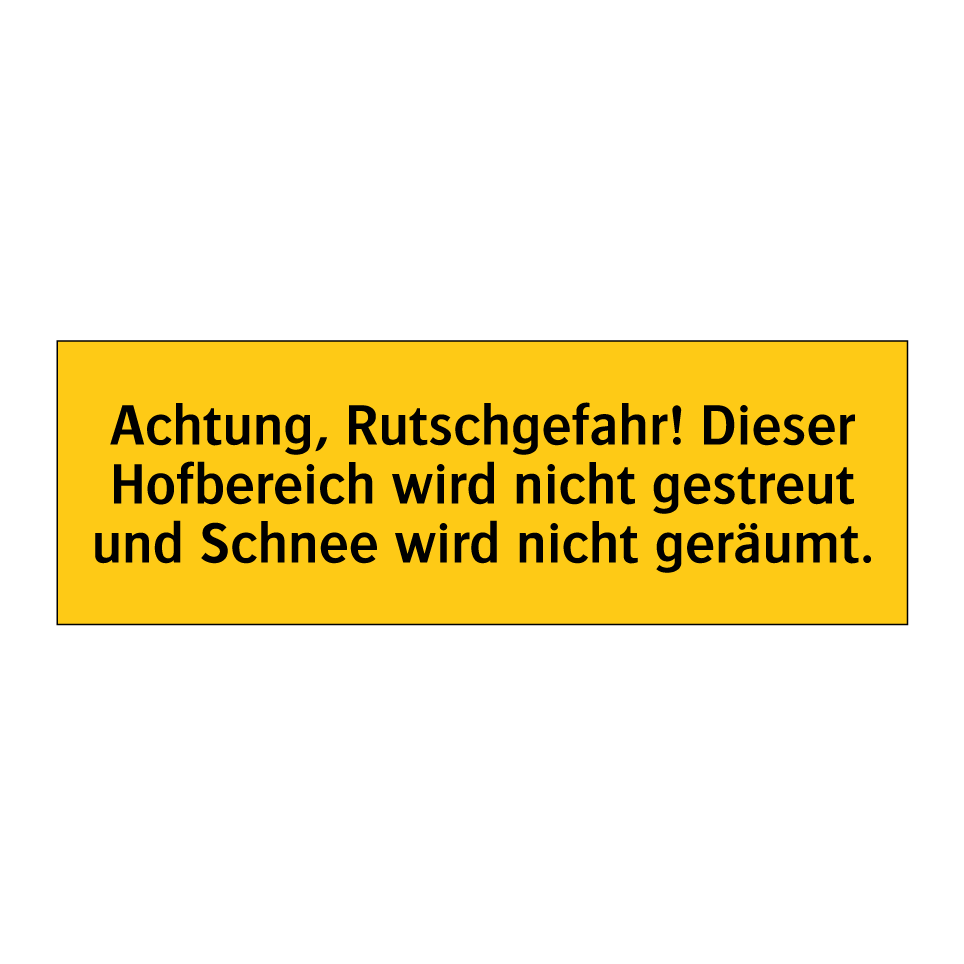 Warnschild mit dem Text Achtung, Rutschgefahr! Dieser Hofbereich wird nicht gestreut und Schnee wird nicht geräumt.