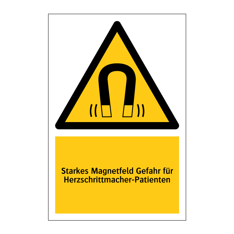 Warnschild mit dem Text Starkes Magnetfeld Gefahr für Herzschrittmacher-Patienten