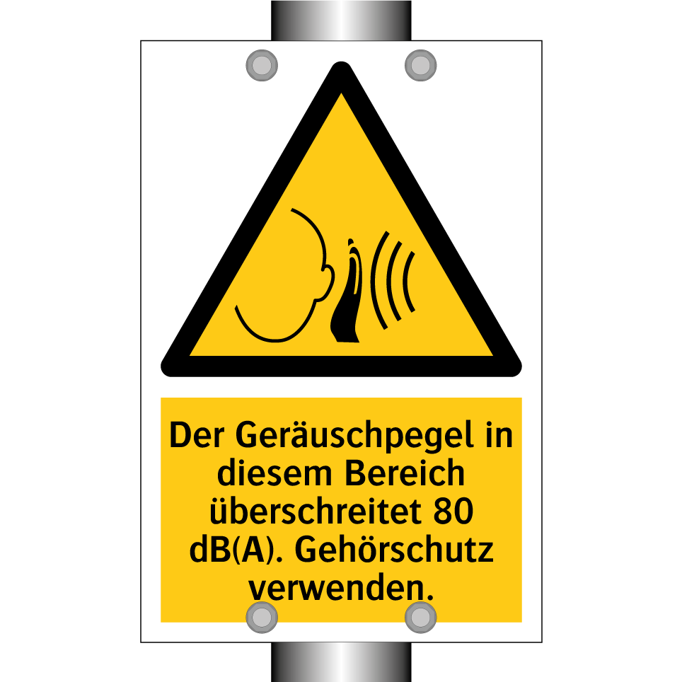 Warnschild mit dem Text Der Geräuschpegel in diesem Bereich überschreitet 80 dB(A). Gehörschutz verwenden.