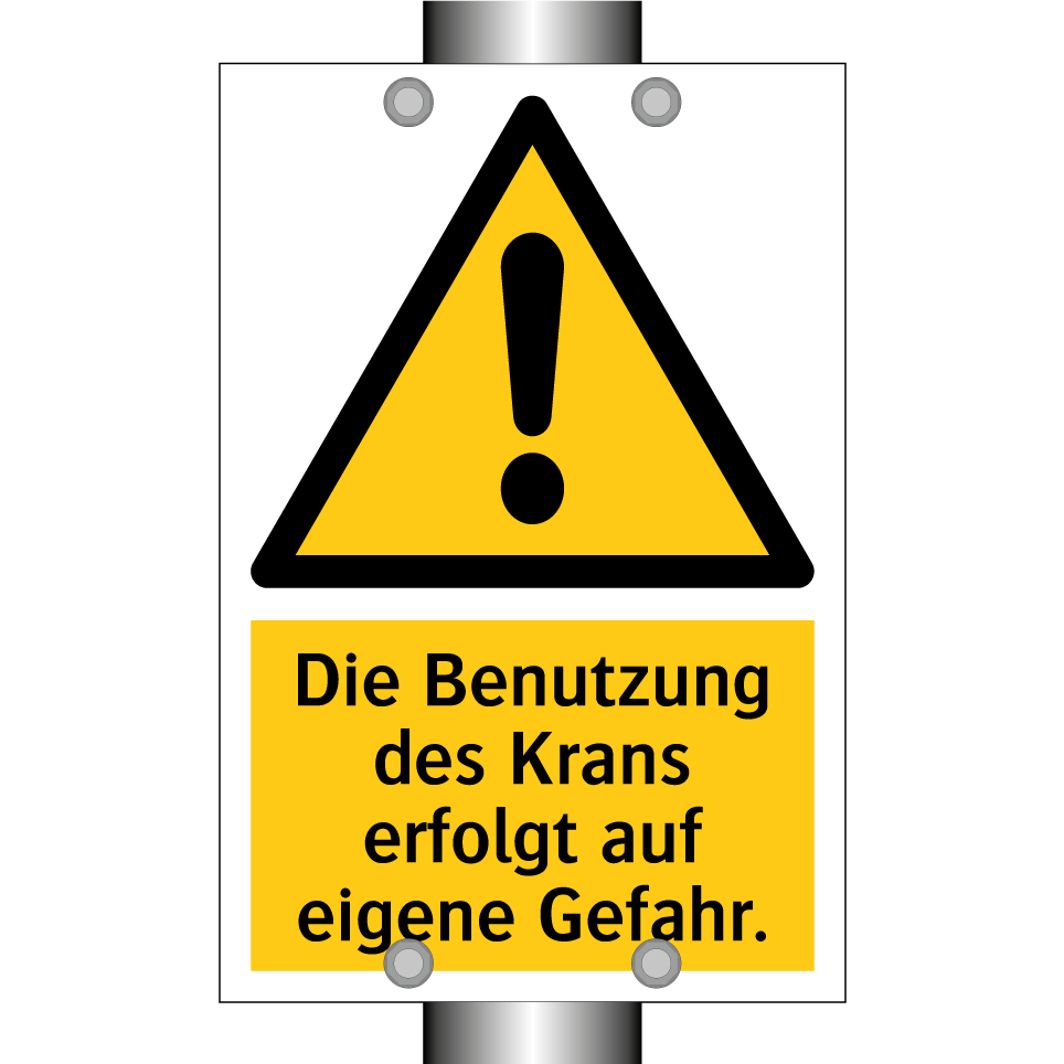 Warnschild mit dem Text Die Benutzung des Krans erfolgt auf eigene Gefahr.