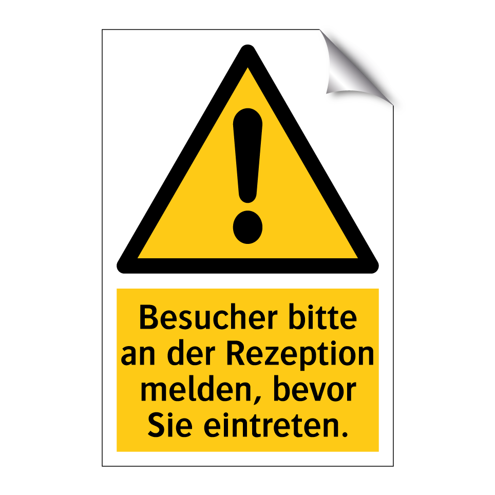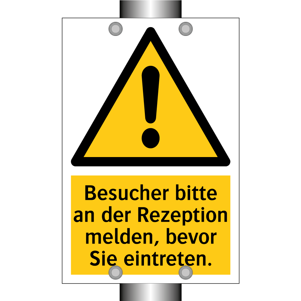 Warnschild mit dem Text Besucher bitte an der Rezeption melden, bevor Sie eintreten.