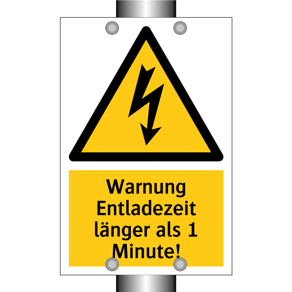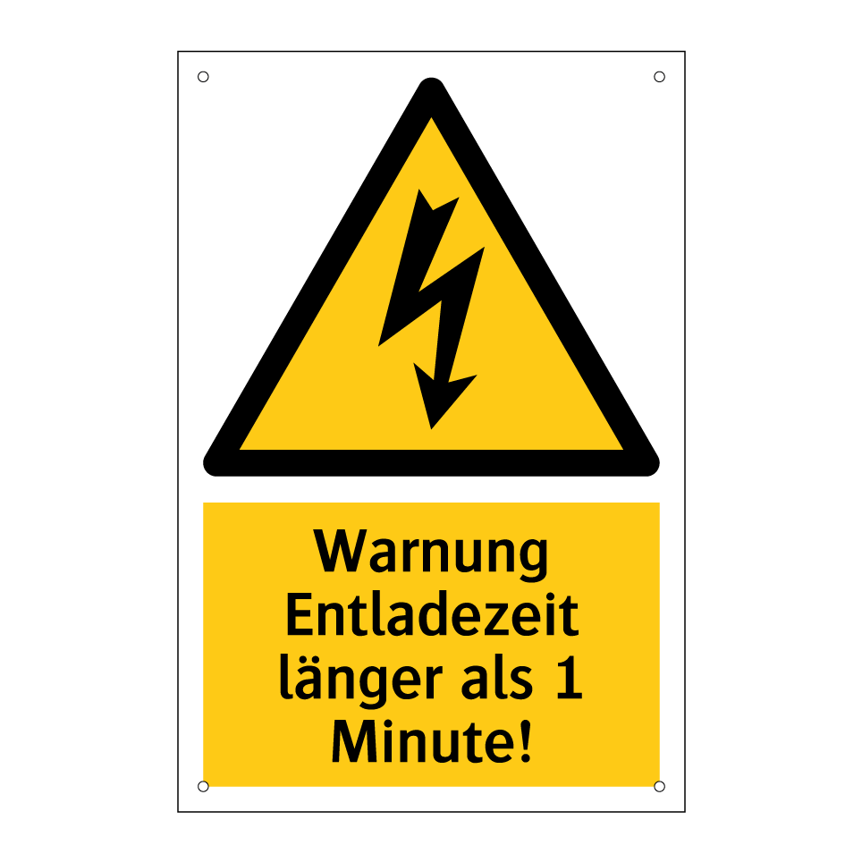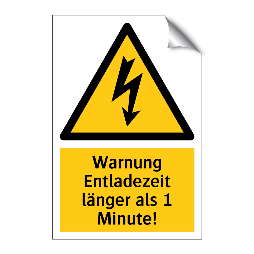 Warnschild mit dem Text Warnung Entladezeit länger als 1 Minute!