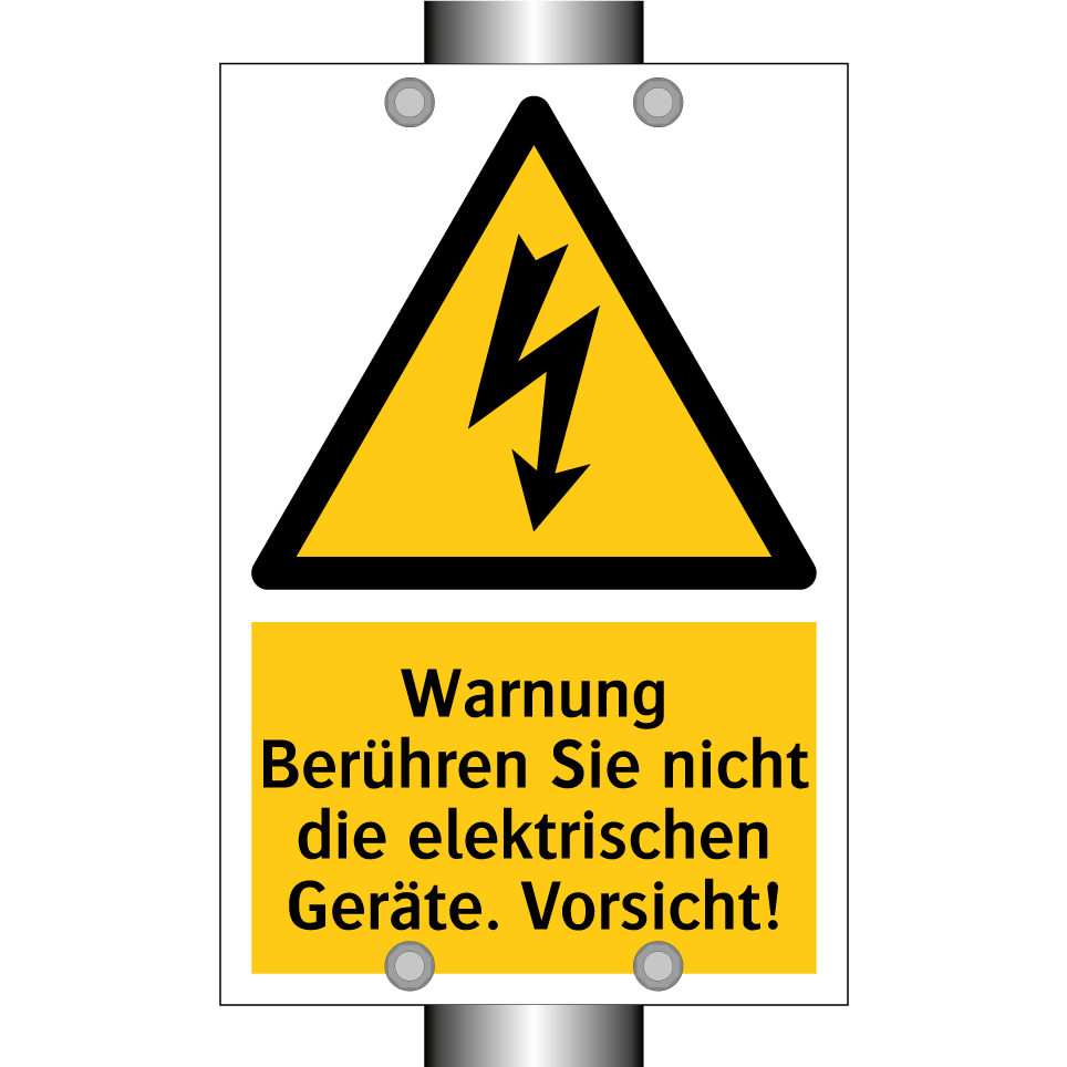 Warnschild mit dem Text Warnung Berühren Sie nicht die elektrischen Geräte. Vorsicht!