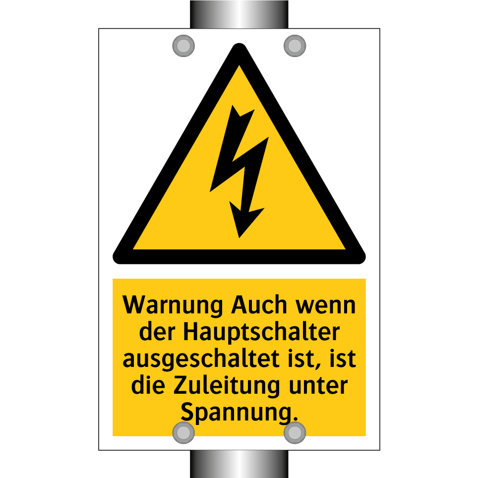 Warnschild mit dem Text Warnung Auch wenn der Hauptschalter ausgeschaltet ist, ist die Zuleitung unter Spannung.