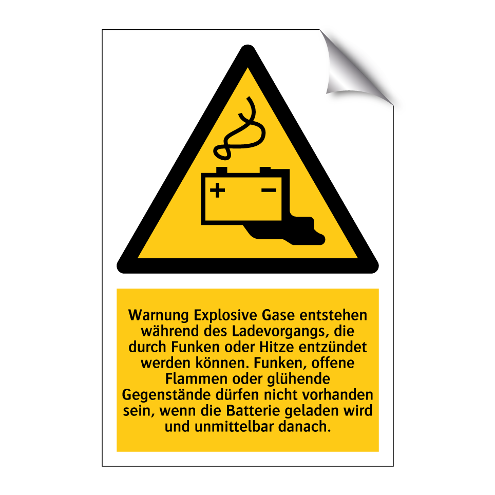 Warnschild mit dem Text Warnung Explosive Gase entstehen während des Ladevorgangs, die durch Funken oder Hitze entzündet werden können. Funken, offene Flammen oder glühende Gegenstände dürfen nicht vorhanden sein, wenn die Batterie geladen wird und unmittelbar danach.