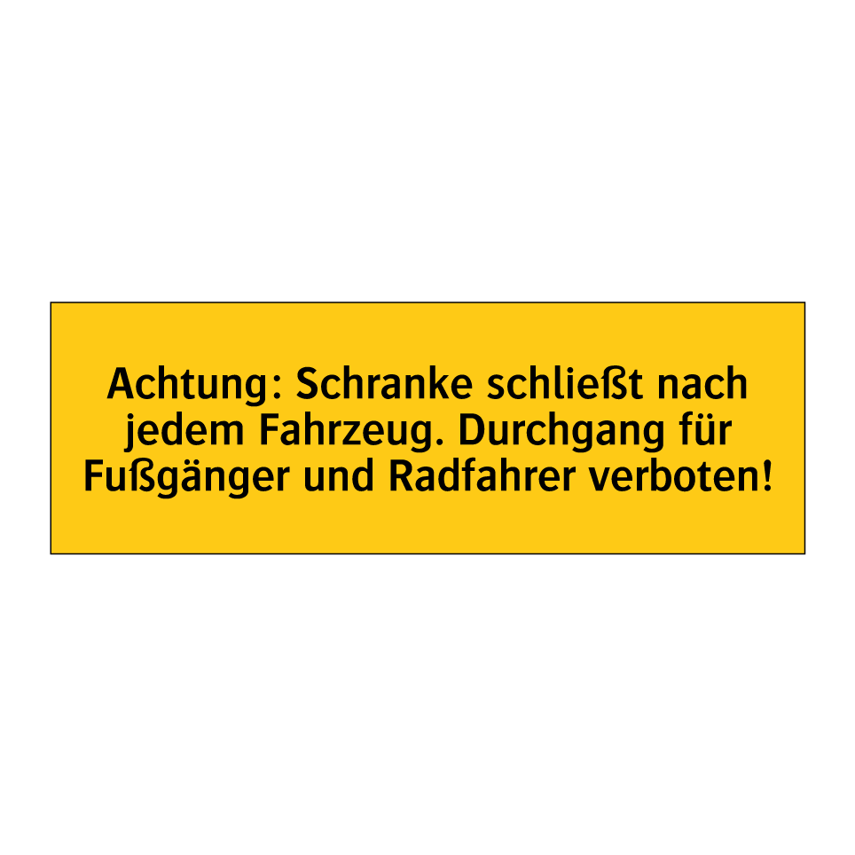 Warnschild mit dem Text Achtung: Schranke schließt nach jedem Fahrzeug. Durchgang für Fußgänger und Radfahrer verboten!