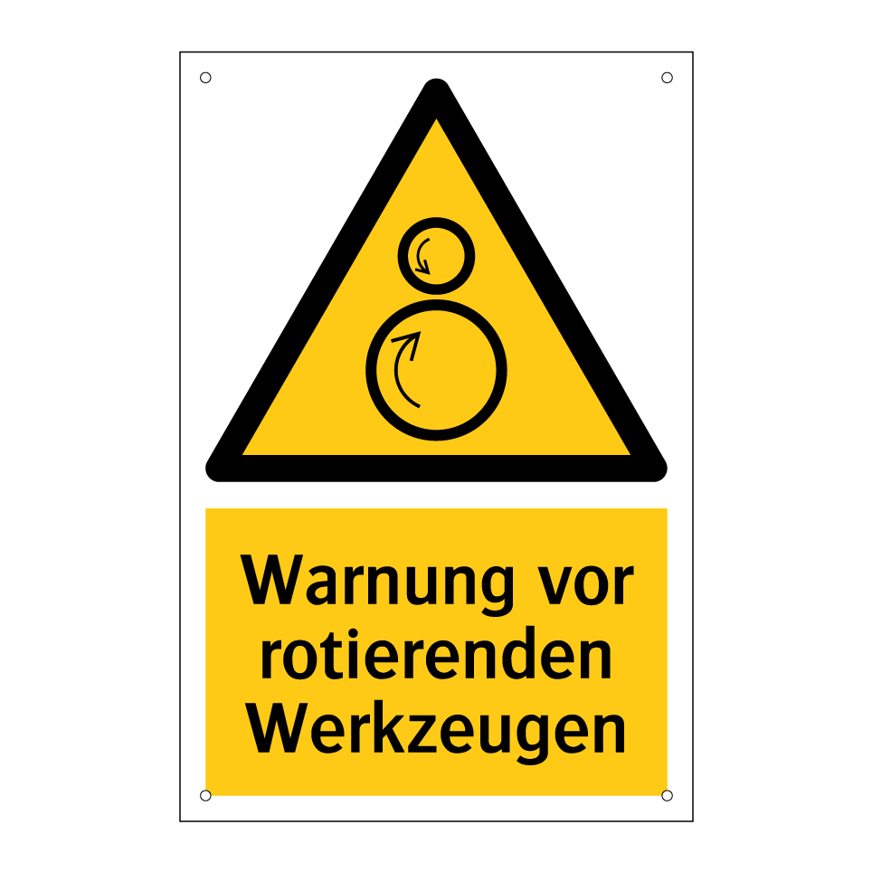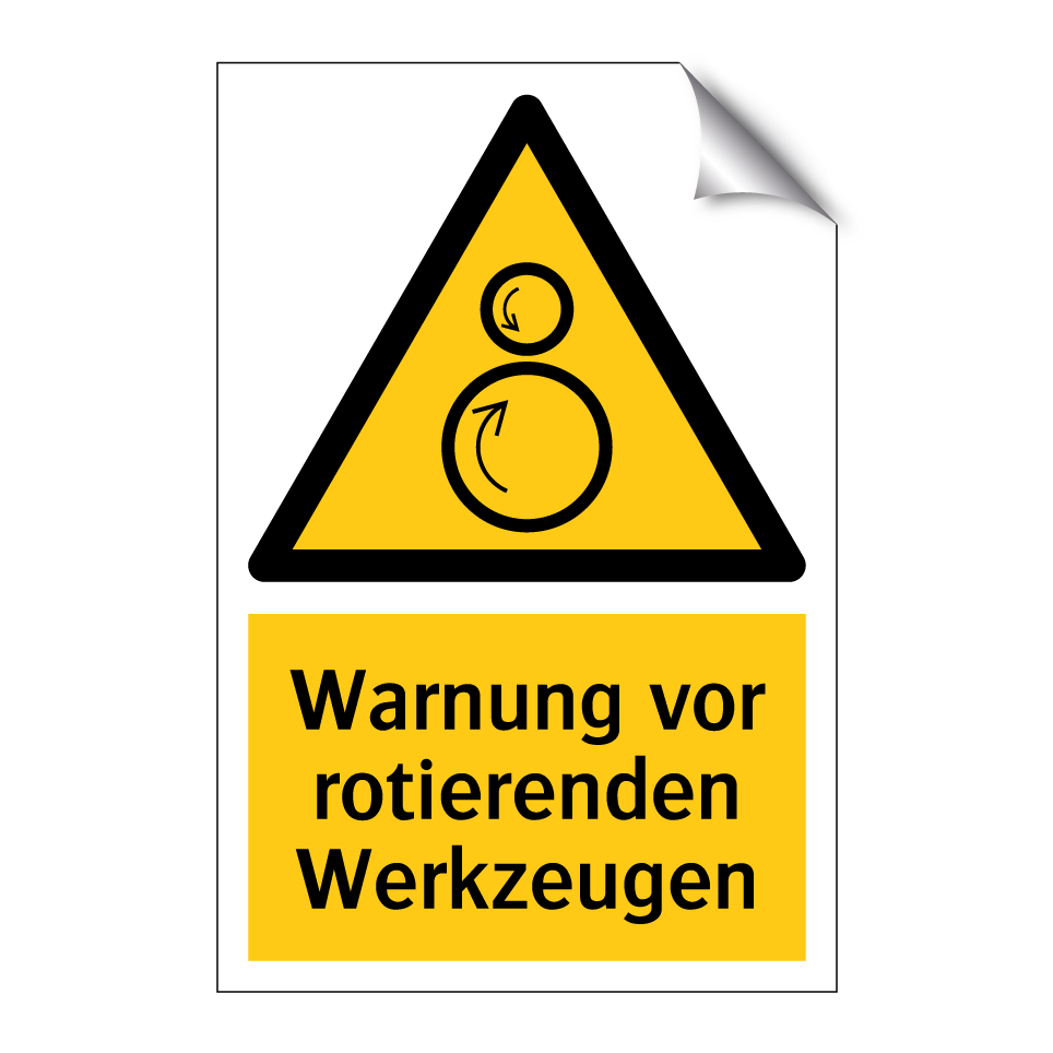 Warnschild mit dem Text Warnung vor rotierenden Werkzeugen