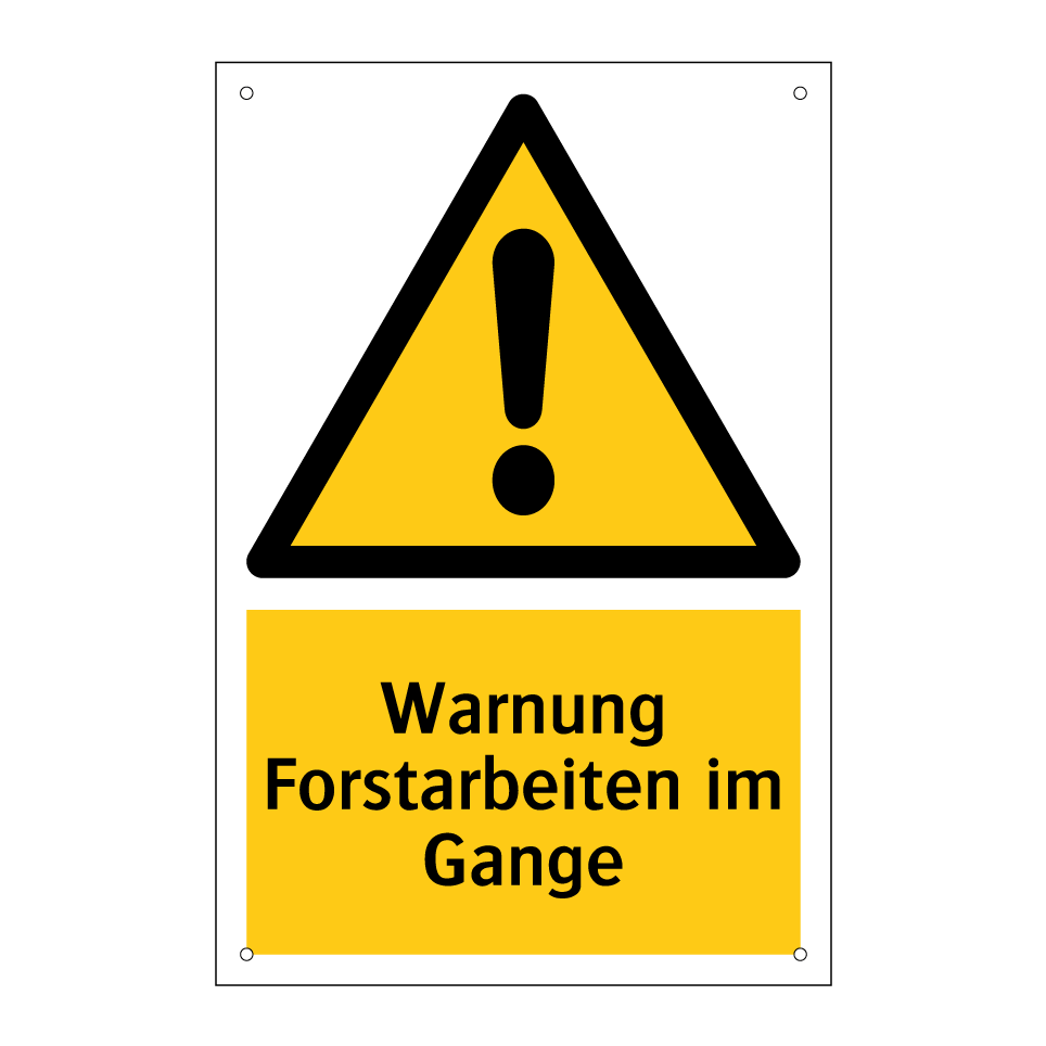 Warnschild mit dem Text Warnung Forstarbeiten im Gange