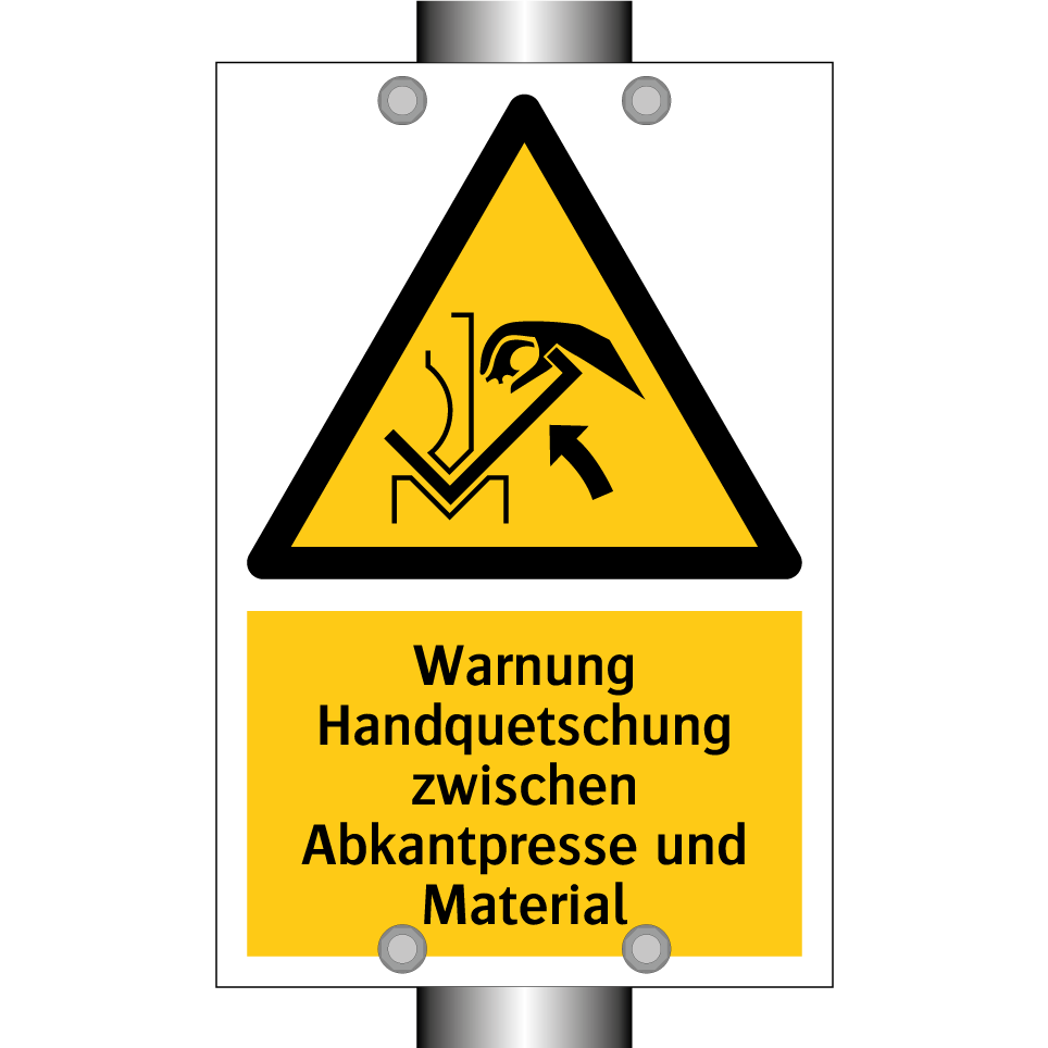 Warnschild mit dem Text Warnung Handquetschung zwischen Abkantpresse und Material