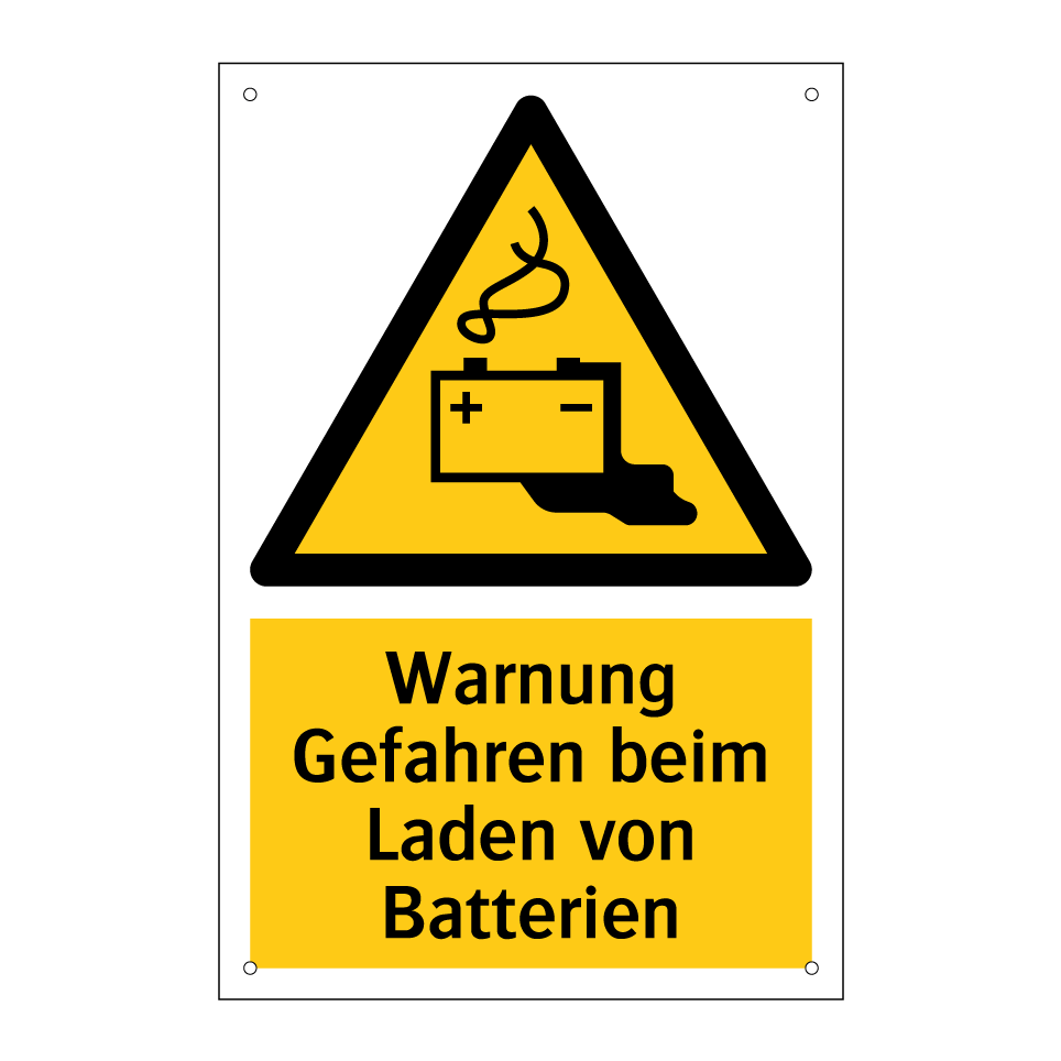 Warnschild mit dem Text Warnung Gefahren beim Laden von Batterien