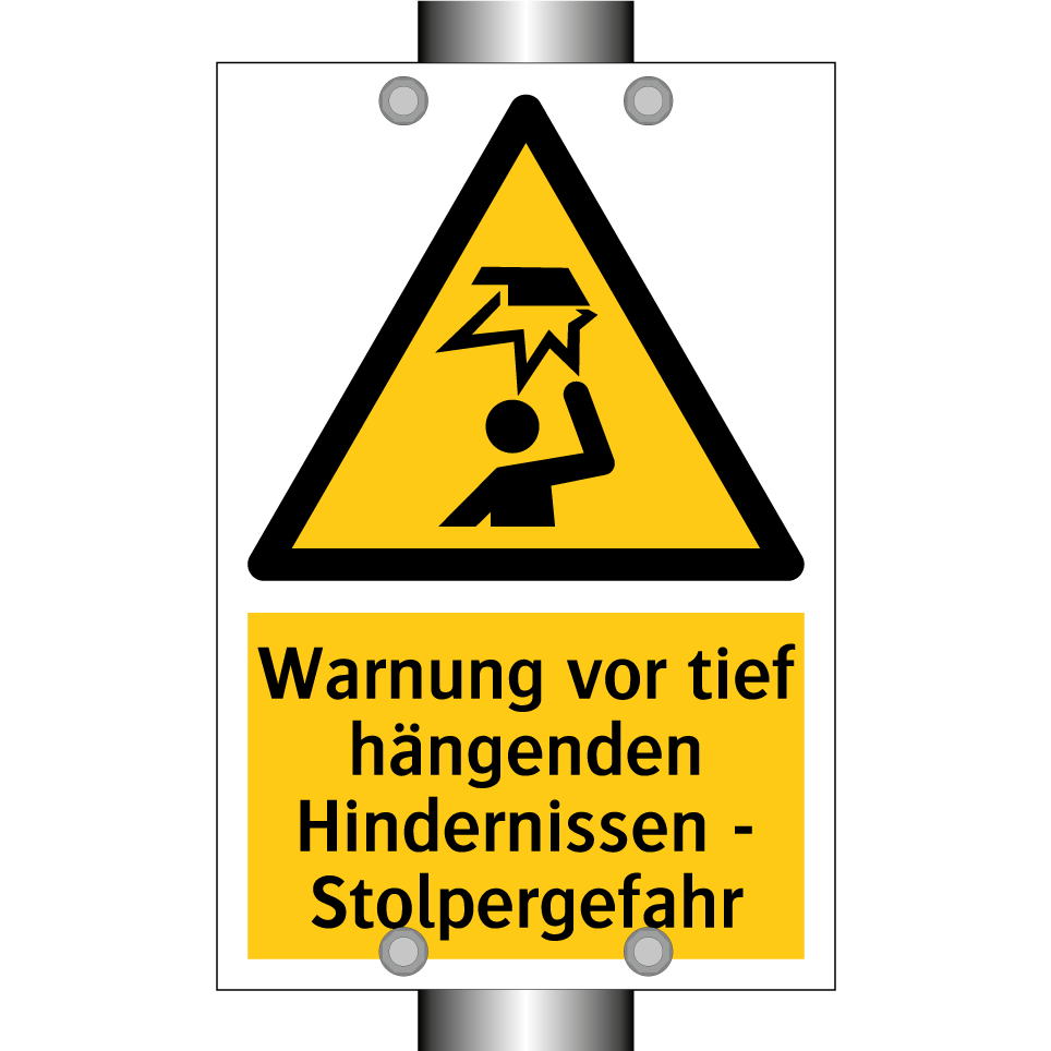Warnschild mit dem Text Warnung vor tief hängenden Hindernissen - Stolpergefahr