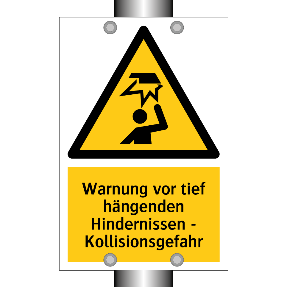Warnschild mit dem Text Warnung vor tief hängenden Hindernissen - Kollisionsgefahr