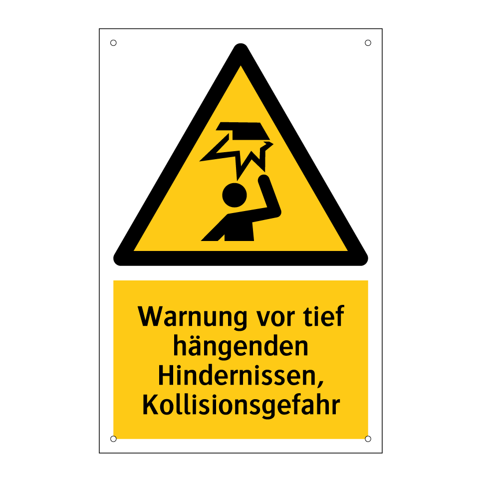 Warnschild mit dem Text Warnung vor tief hängenden Hindernissen, Kollisionsgefahr