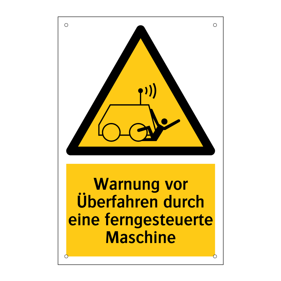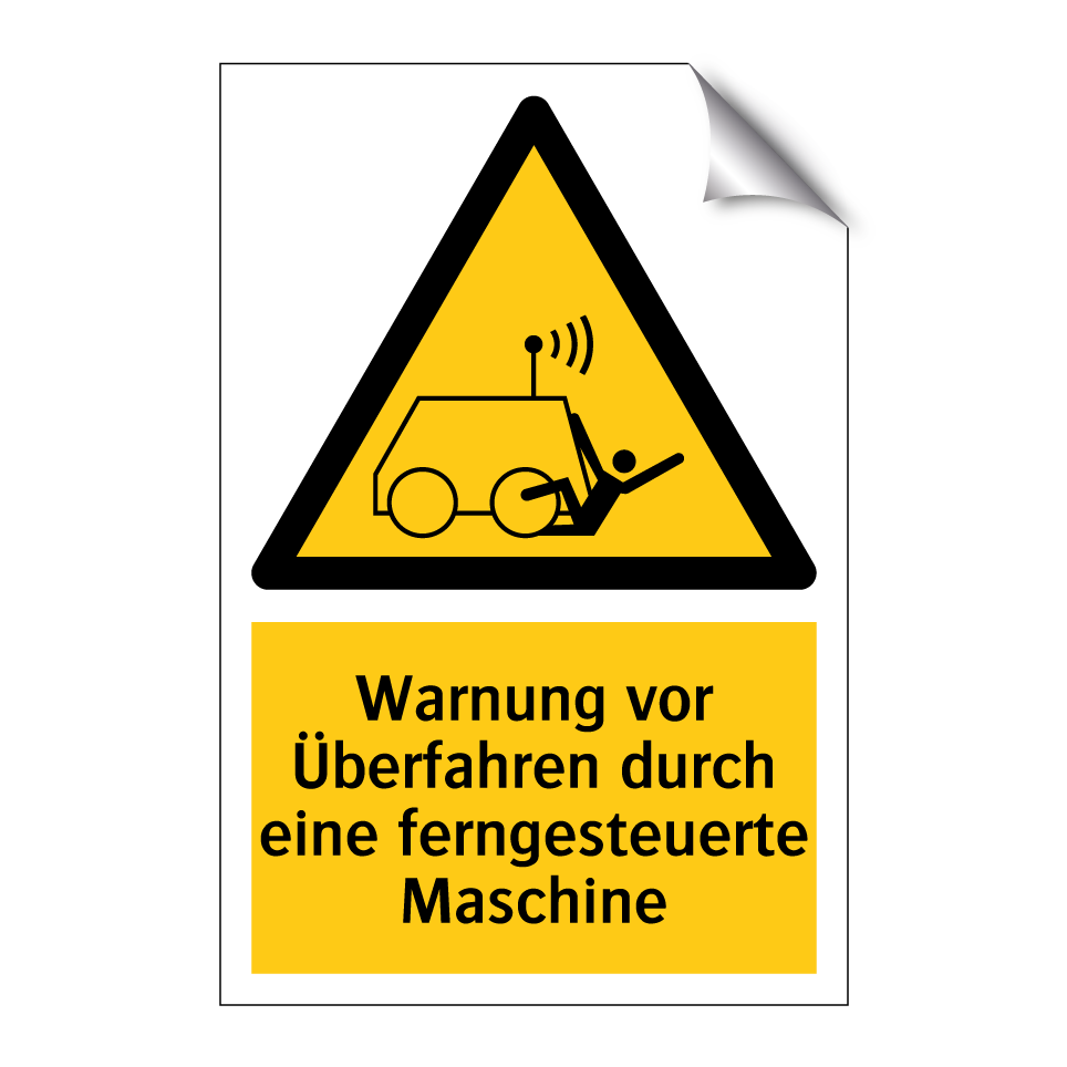 Warnschild mit dem Text Warnung vor Überfahren durch eine ferngesteuerte Maschine