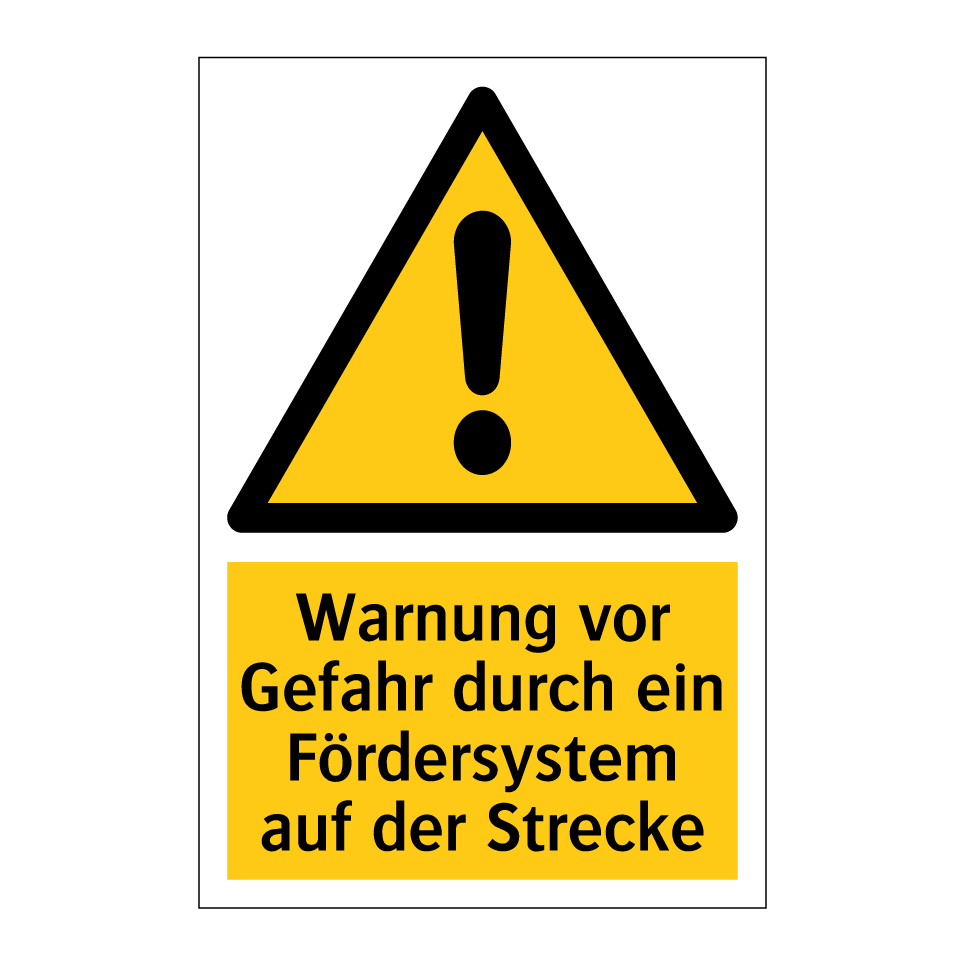 Warnschild mit dem Text Warnung vor Gefahr durch ein Fördersystem auf der Strecke