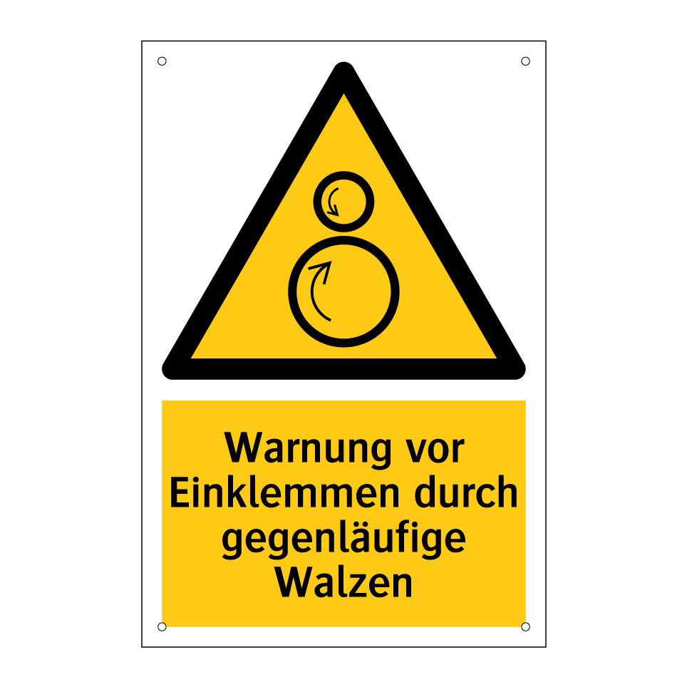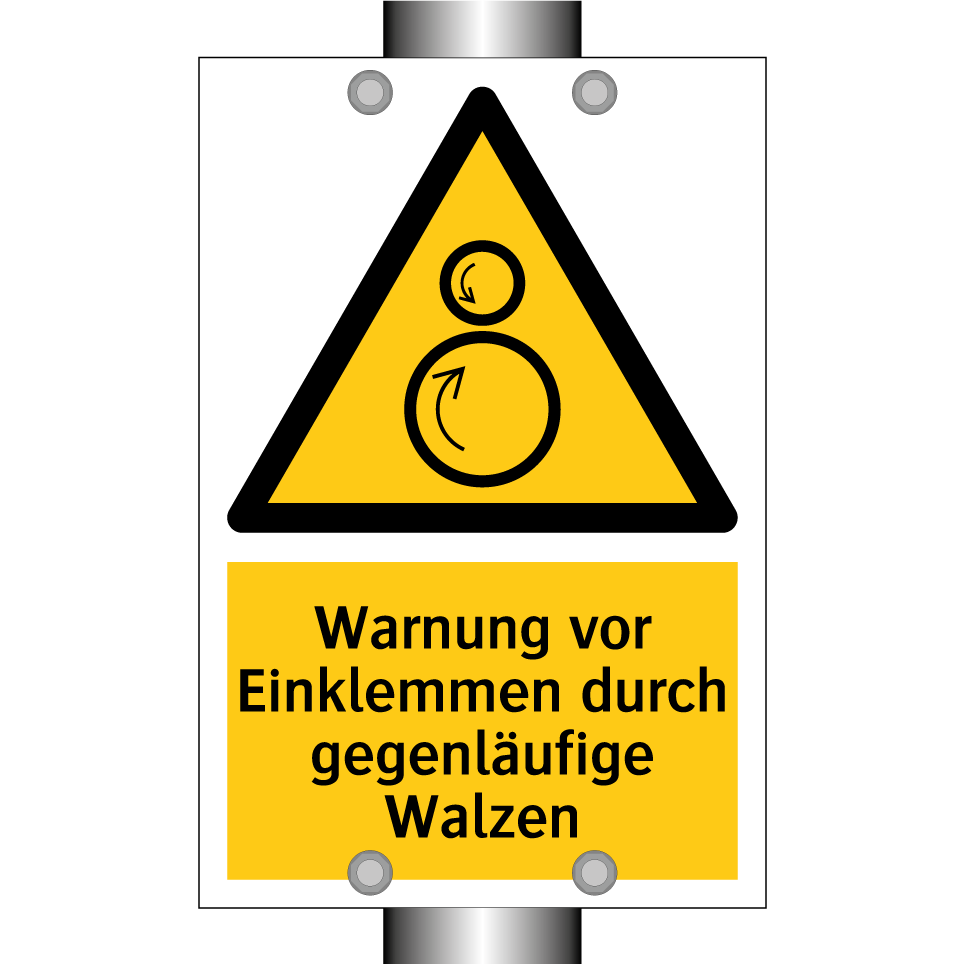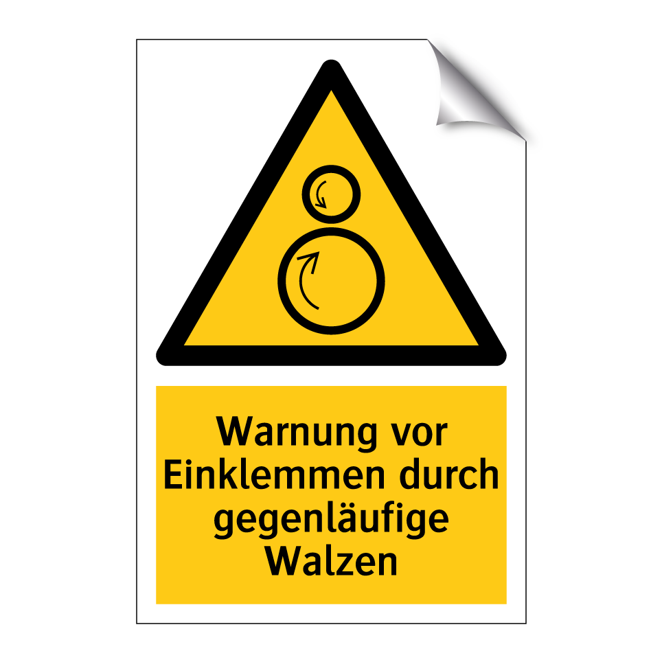 Warnschild mit dem Text Warnung vor Einklemmen durch gegenläufige Walzen