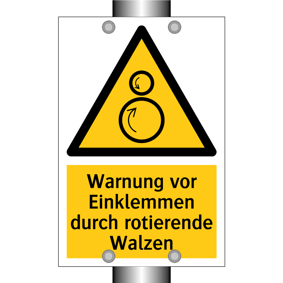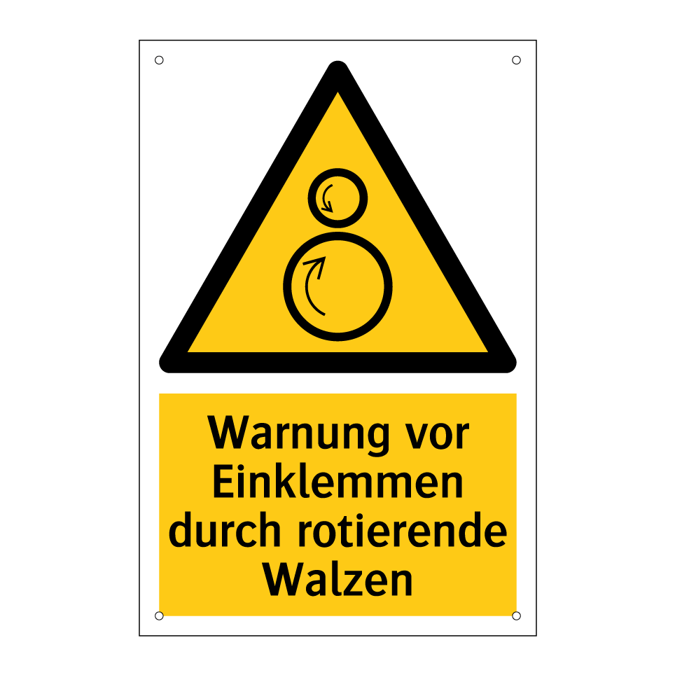 Warnschild mit dem Text Warnung vor Einklemmen durch rotierende Walzen