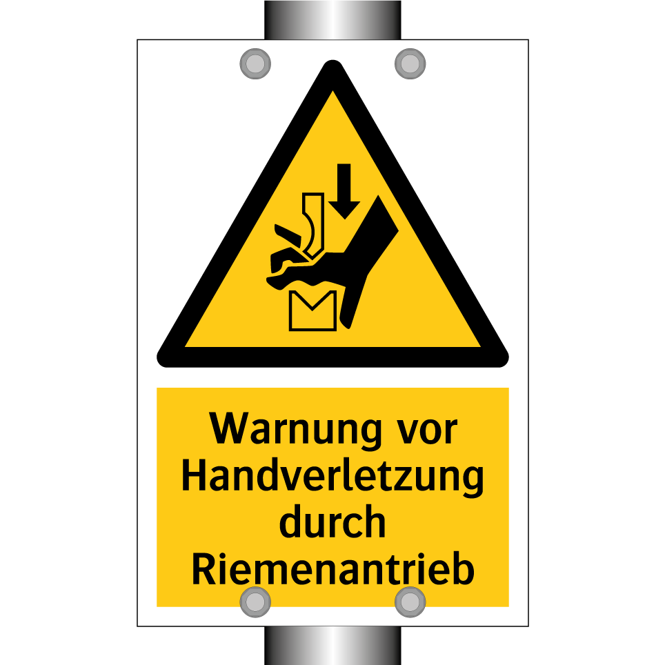 Warnschild mit dem Text Warnung vor Handverletzung durch Riemenantrieb