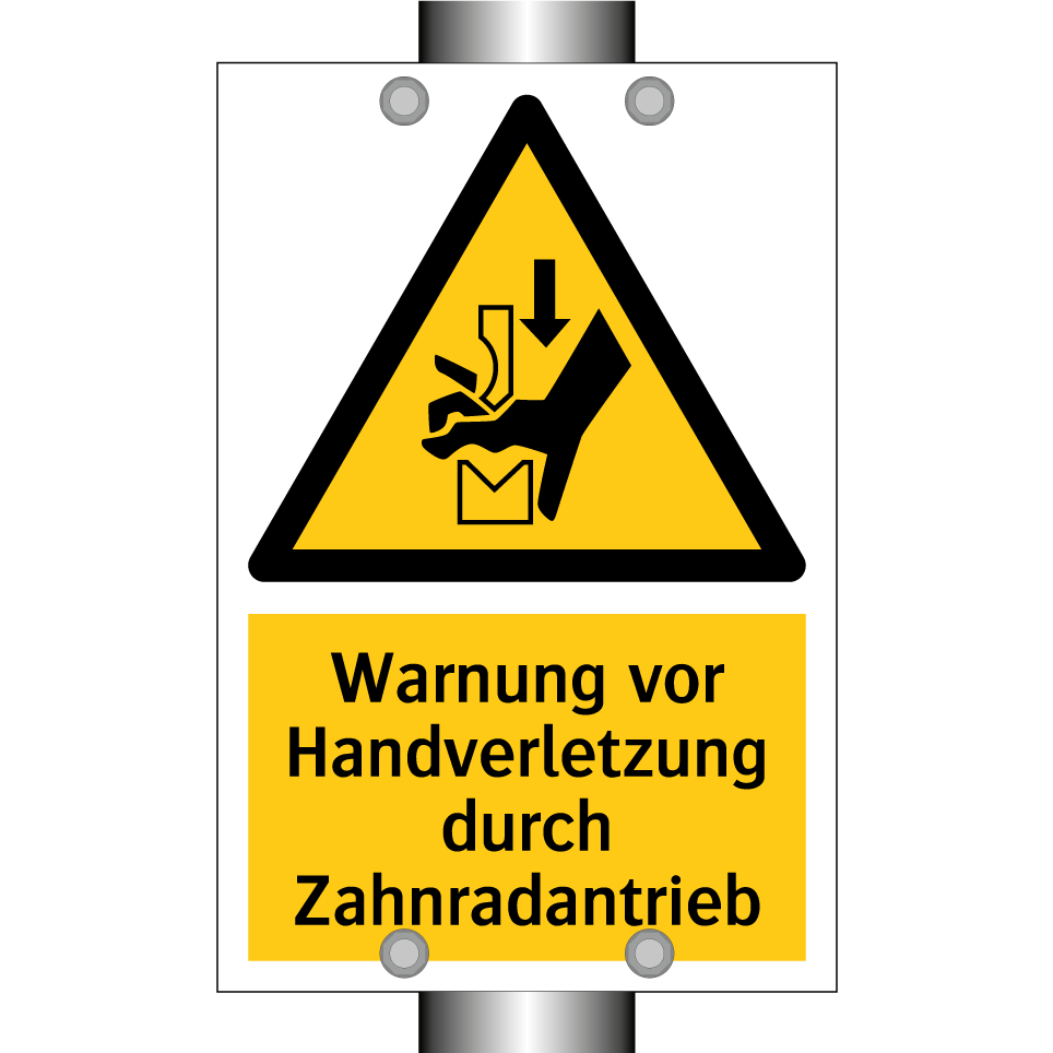 Warnschild mit dem Text Warnung vor Handverletzung durch Zahnradantrieb