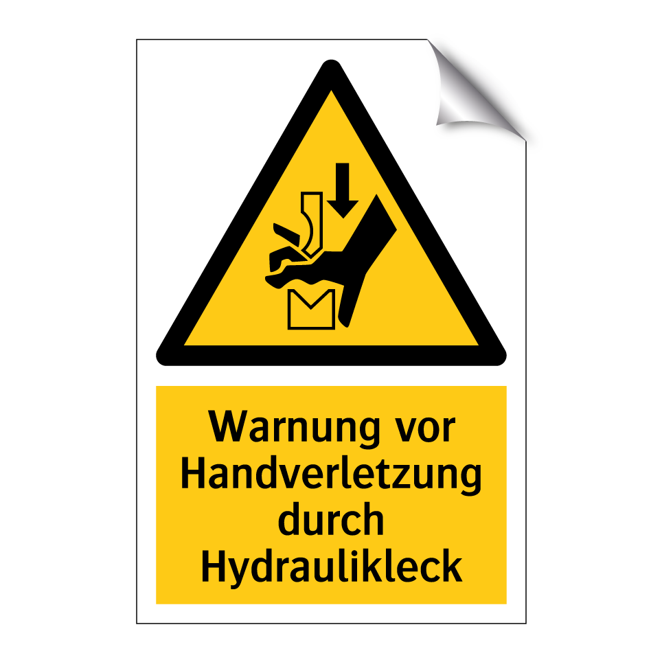 Warnschild mit dem Text Warnung vor Handverletzung durch Hydraulikleck