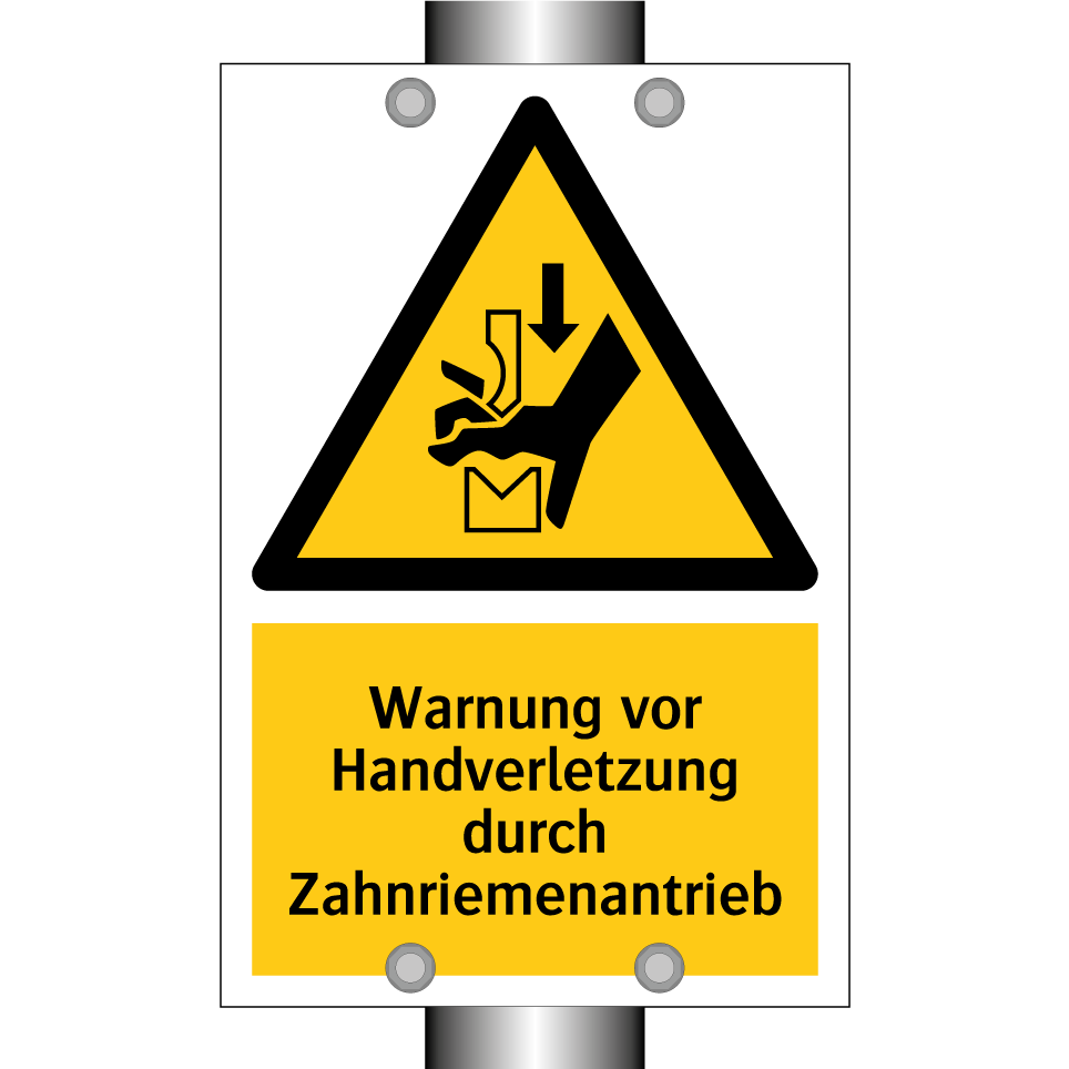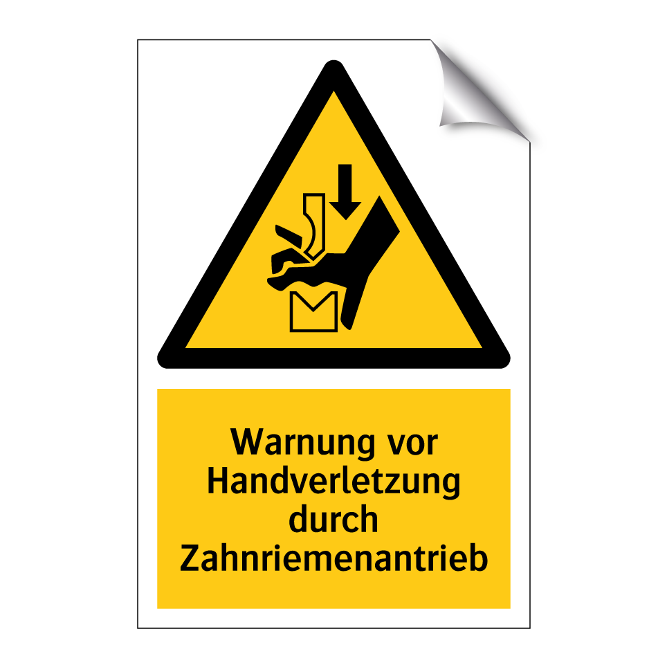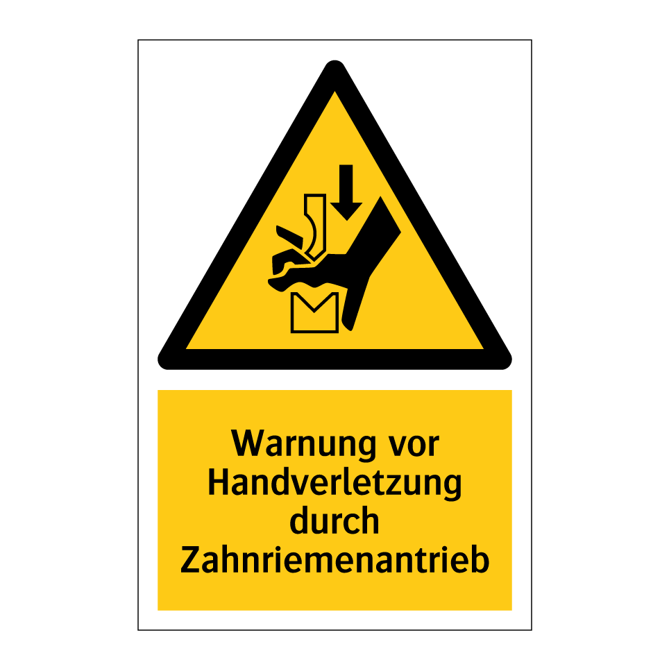 Warnschild mit dem Text Warnung vor Handverletzung durch Zahnriemenantrieb