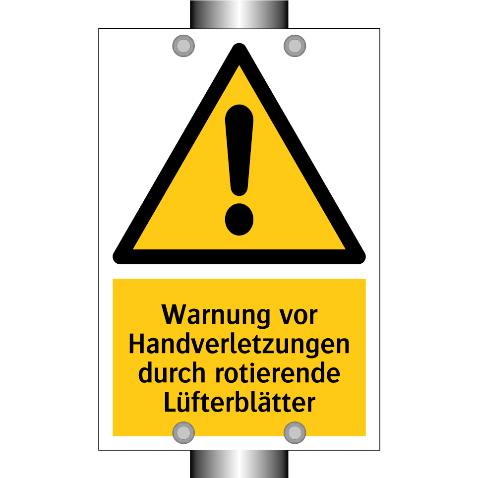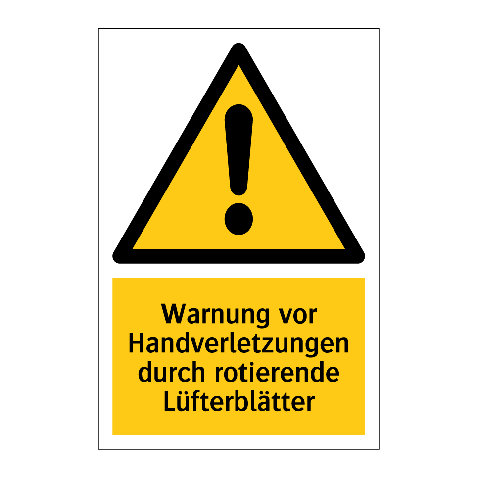 Warnschild mit dem Text Warnung vor Handverletzungen durch rotierende Lüfterblätter