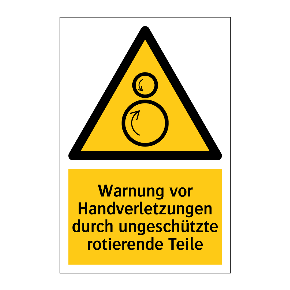 Warnschild mit dem Text Warnung vor Handverletzungen durch ungeschützte rotierende Teile