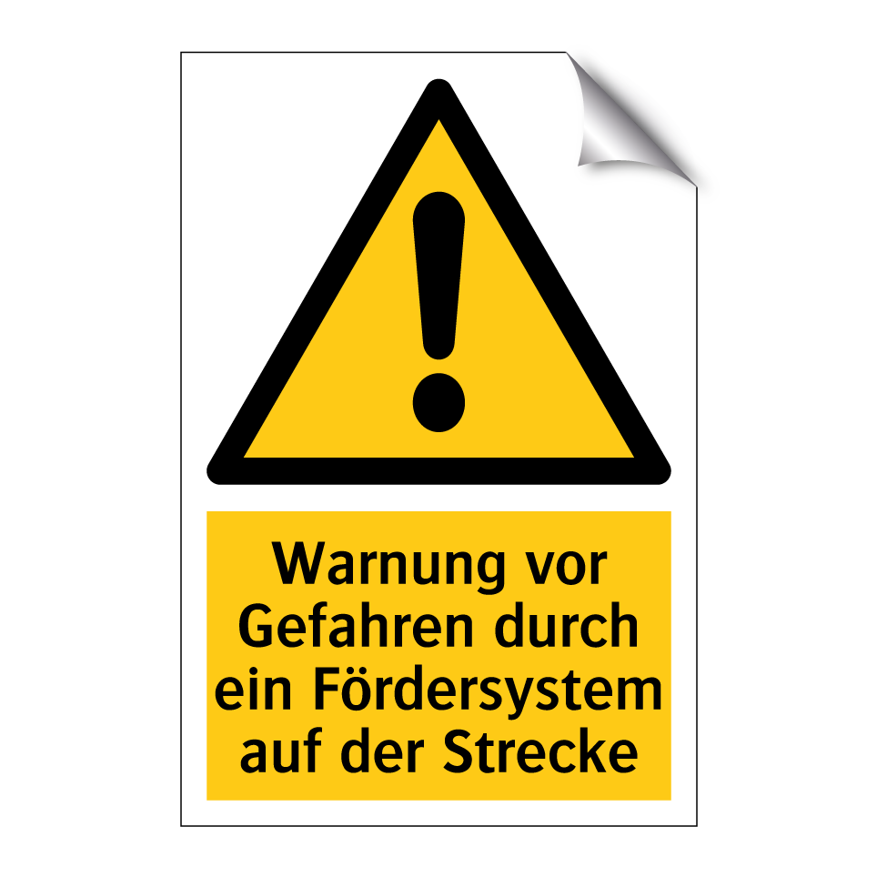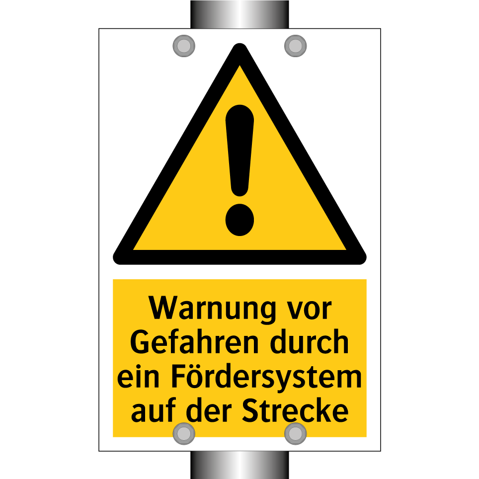 Warnschild mit dem Text Warnung vor Gefahren durch ein Fördersystem auf der Strecke