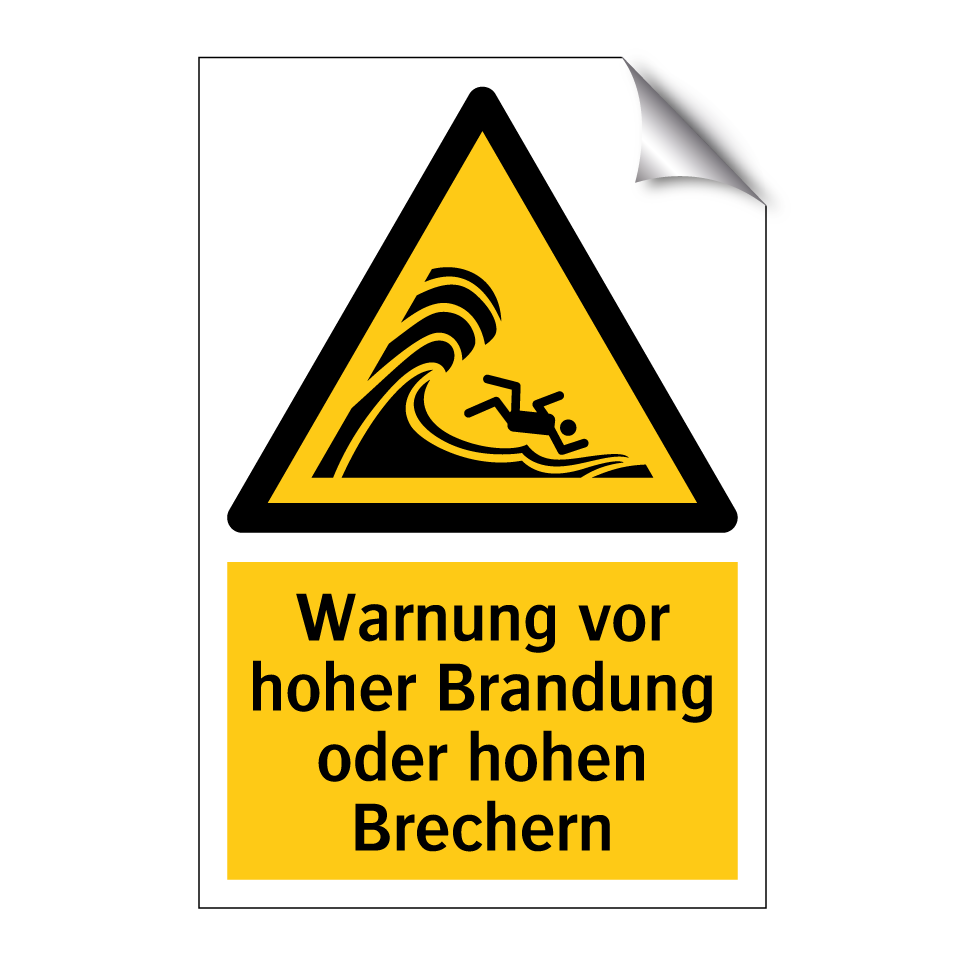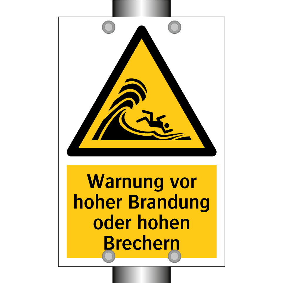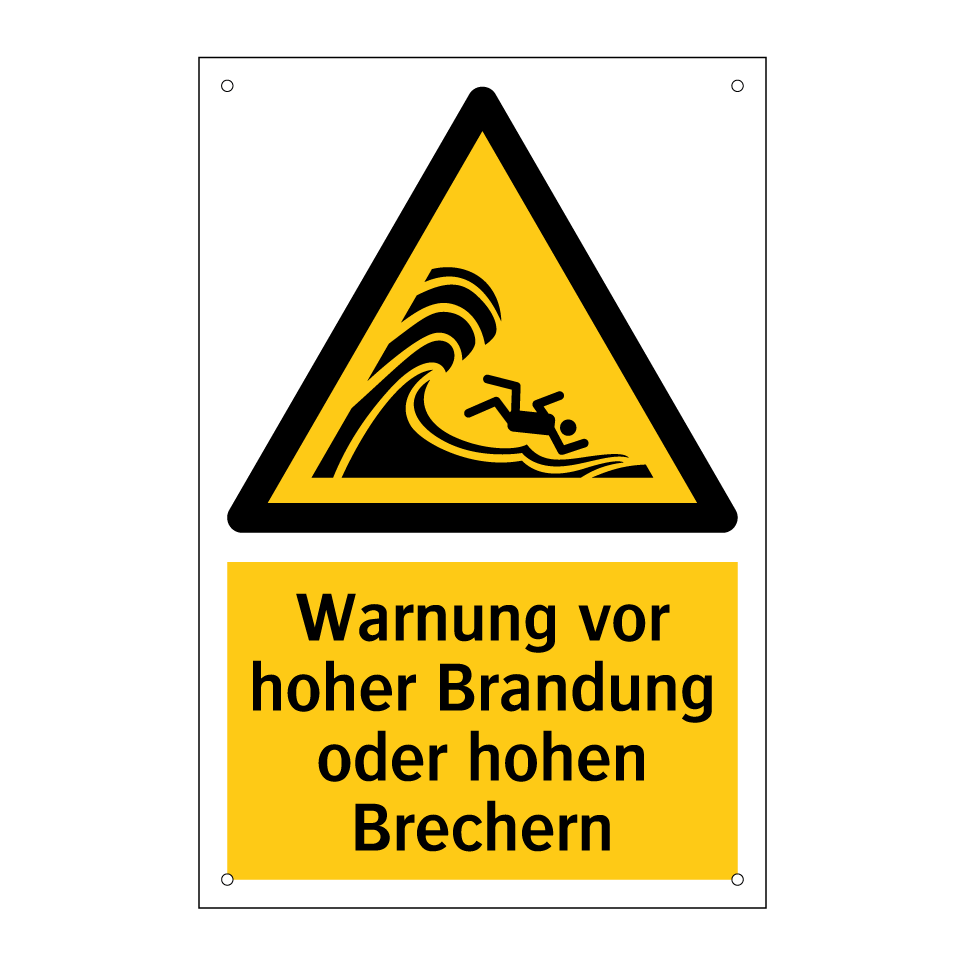 Warnschild mit dem Text Warnung vor hoher Brandung oder hohen Brechern