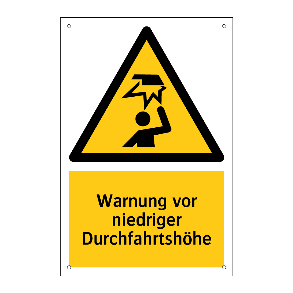 Diese auffällige Warnschild mit gelbem Hintergrund und schwarzem Text ist ideal, um auf niedrige Durchfahrtshöhen hinzuweisen. Sie eignet sich hervorragend für Parkhäuser, Tiefgaragen oder Lagerhallen, wo die Gefahr besteht, dass Fahrzeuge mit hoher Ladung oder großer Höhe kollidieren könnten. Die klare Symbolik und die prägnante Botschaft sorgen dafür, dass die Warnung nicht übersehen wird. Platzieren Sie diese Warnschilder an strategischen Punkten, um die Sicherheit zu erhöhen und Unfälle zu vermeiden. Ob an Einfahrten oder in Innenbereichen, diese Warnung ist ein unverzichtbares Element für jeden Ort mit begrenzter Durchfahrtshöhe.