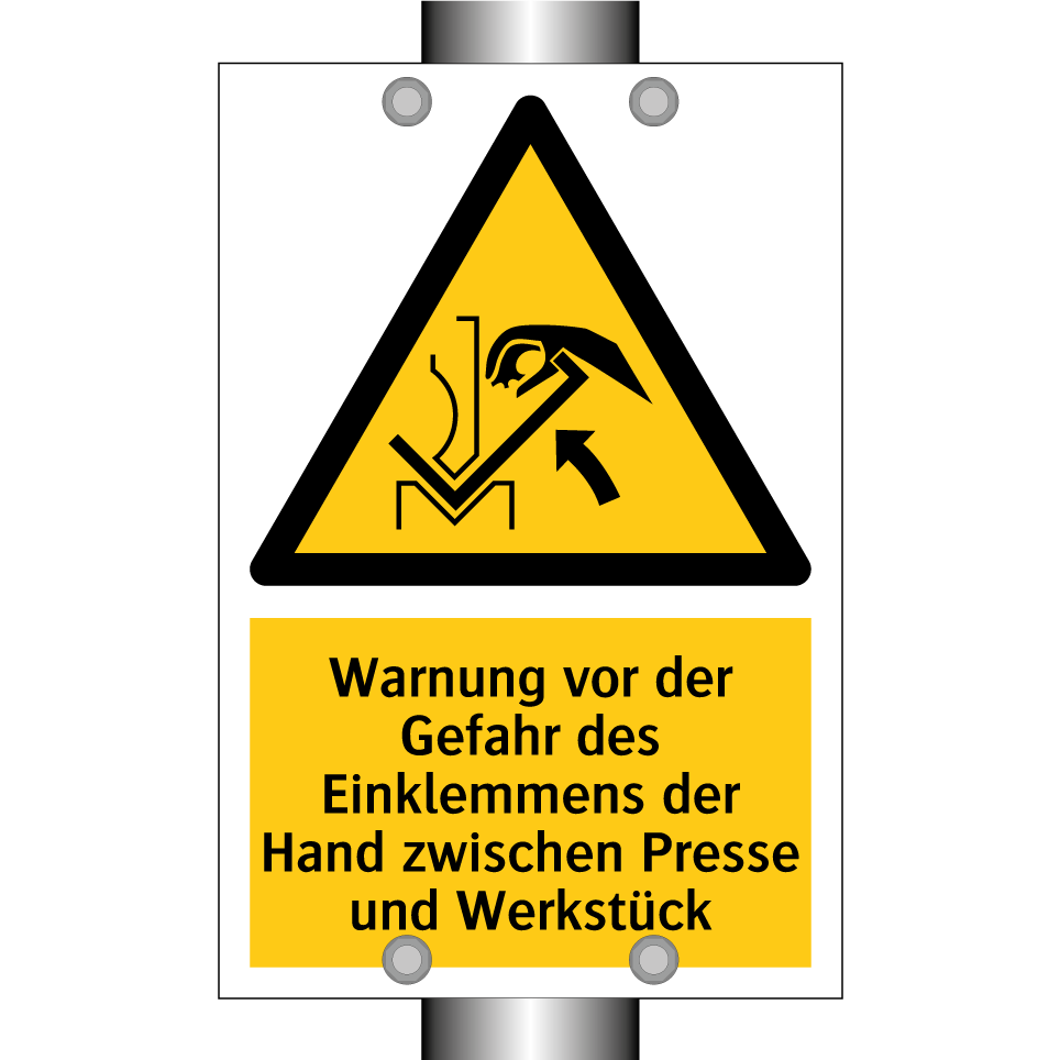 Warnschild mit dem Text Warnung vor der Gefahr des Einklemmens der Hand zwischen Presse und Werkstück