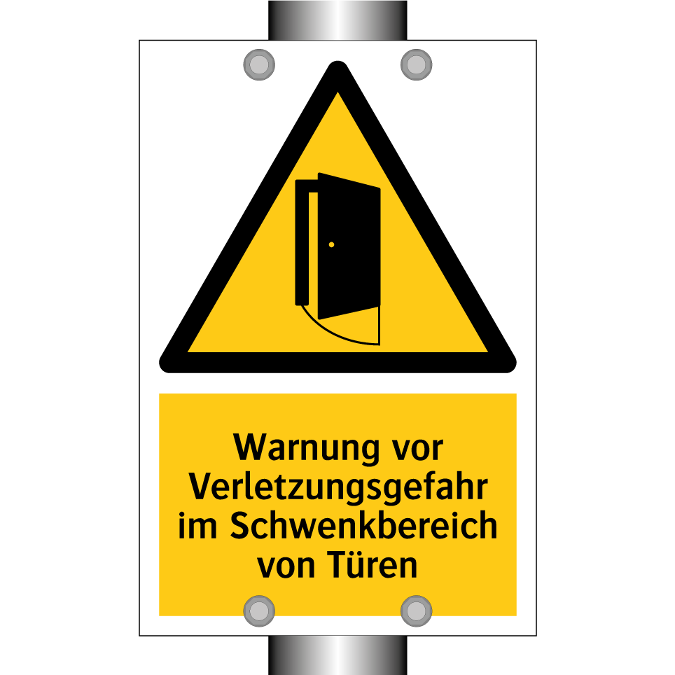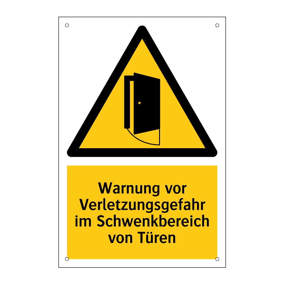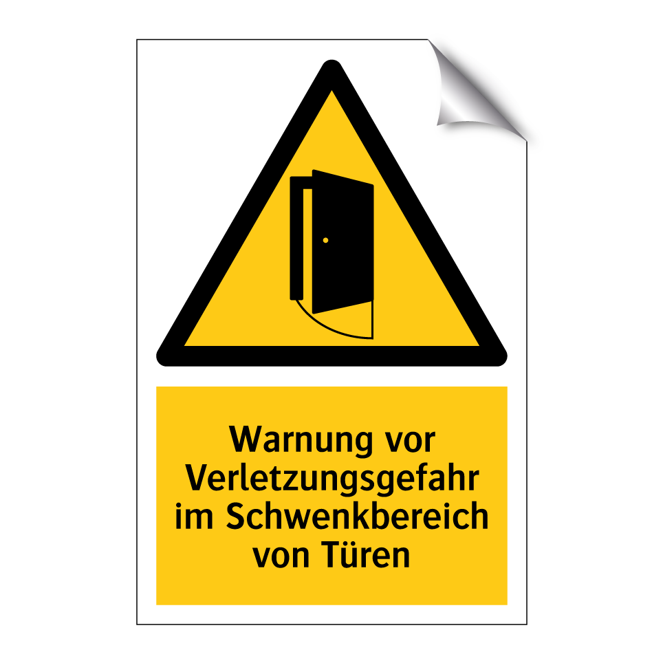Warnschild mit dem Text Warnung vor Verletzungsgefahr im Schwenkbereich von Türen